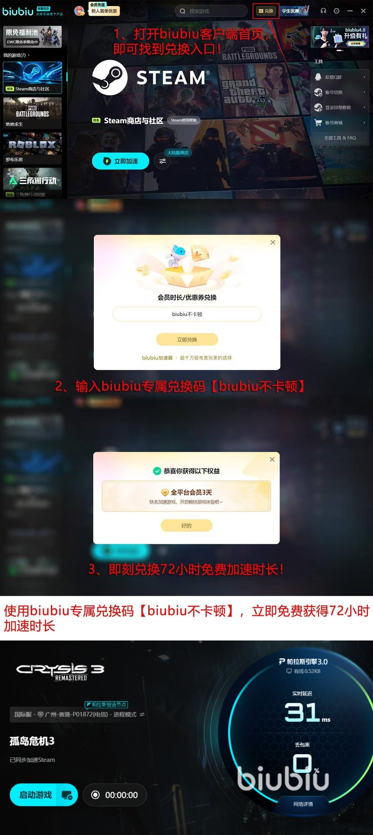 现在新用户在第一次使用这个加速器的时候是获取到不错福利。新用户在这款加速器之中可以获取到24小时的免费加速时间。使用兑换码【biubiu不卡顿】则是可以额外的获取到3天的免费加速。