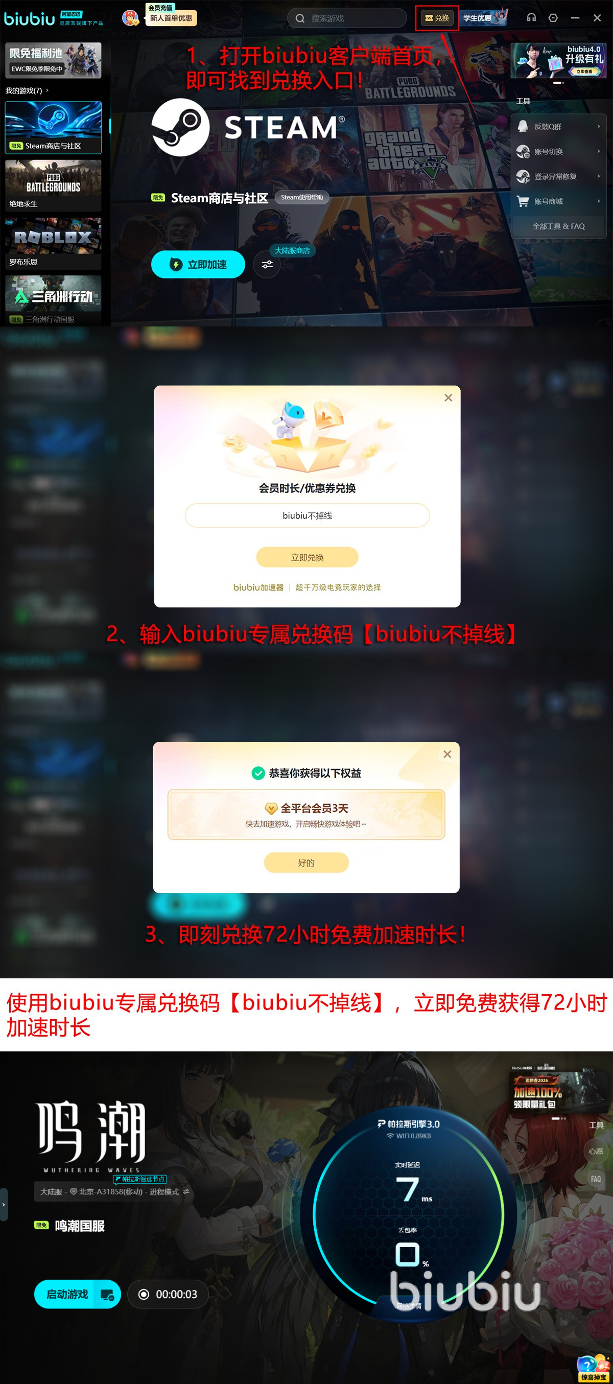 为帮助鸣潮玩家无忧畅玩,biubiu加速器推出新用户注册即得首日24小时全功能免费加速体验,输入【biubiu不掉线】享受今州大陆丝滑战斗72小时。双福利叠加,新人可以获得最长96小时的加速服务,可以完全体验稳定流畅的游戏环境。