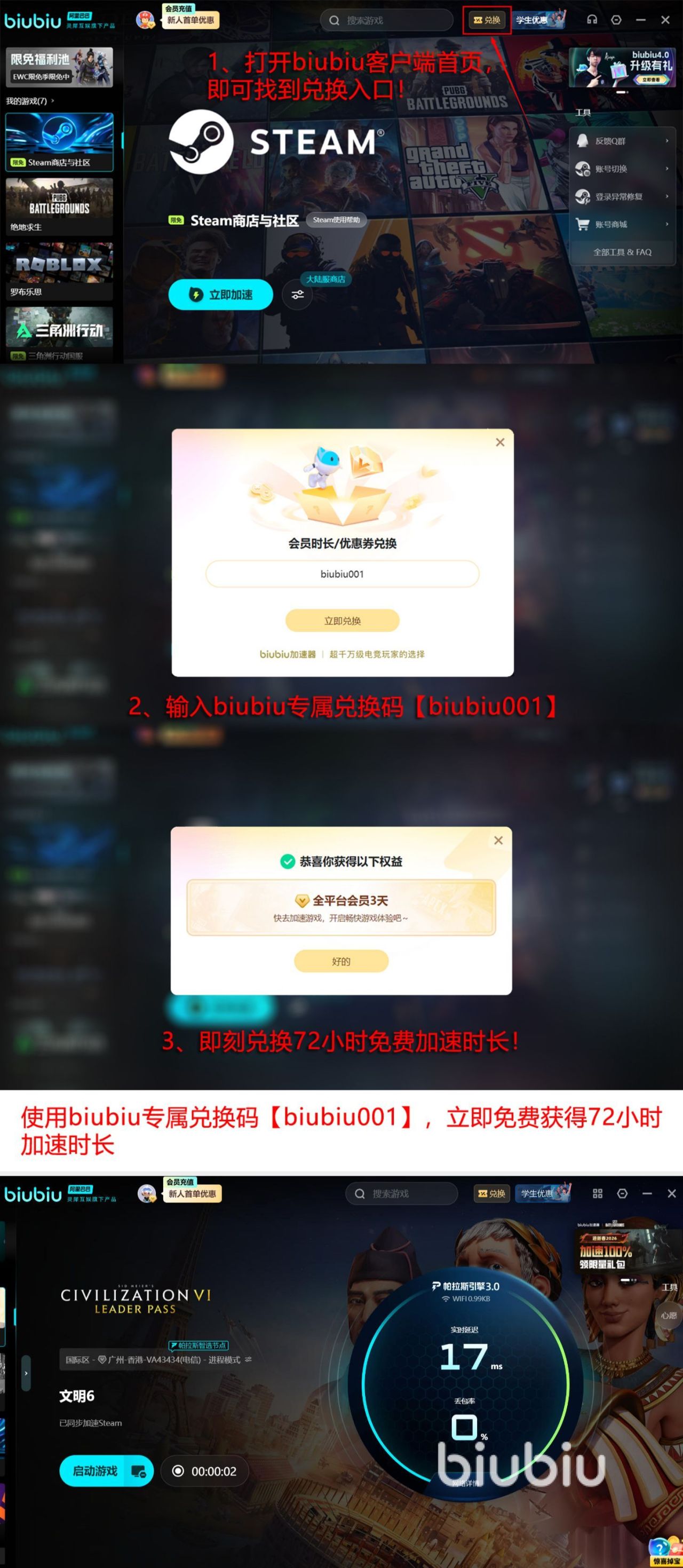 采用目前先进的帕拉斯3.0引擎技术所展现,从技术方面进行了全新的升级和加持,其次也是阿里巴巴灵犀互娱旗下的产品早已凭借着实力,得到了pubg冠军小叮当的推荐。在多重保障情况之下,让大家肆无忌惮的使用。其次,要说到福利方面更是引人注目,因为所有的用户都可输入【biubiu001】,获得三天的免费时长,还有一个优势就是新用户只要成功注册之后,就可拥有24小时的免费时长。那么这样累积下来,就可轻轻松松享受96个小时。