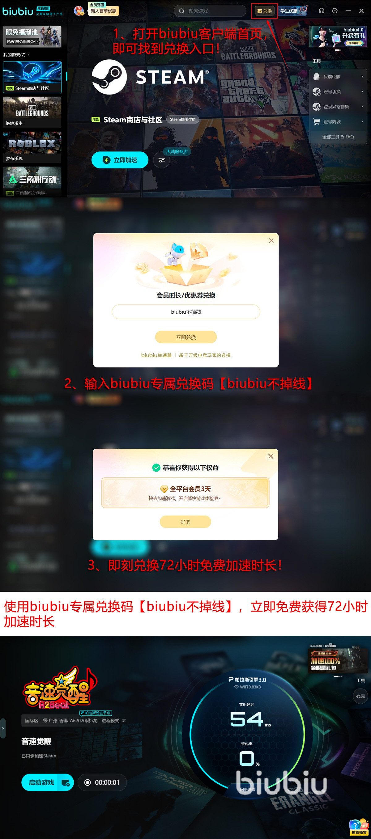 对于初次接触biubiu的玩家来说,平台诚意满满,注册成功后立即激活首日24小时全功能免费试用权限,输入【biubiu不掉线】继续体验极速狂飙的快感72小时,即可以享受96小时的优质加速服务,完全摆脱卡门的烦恼。
