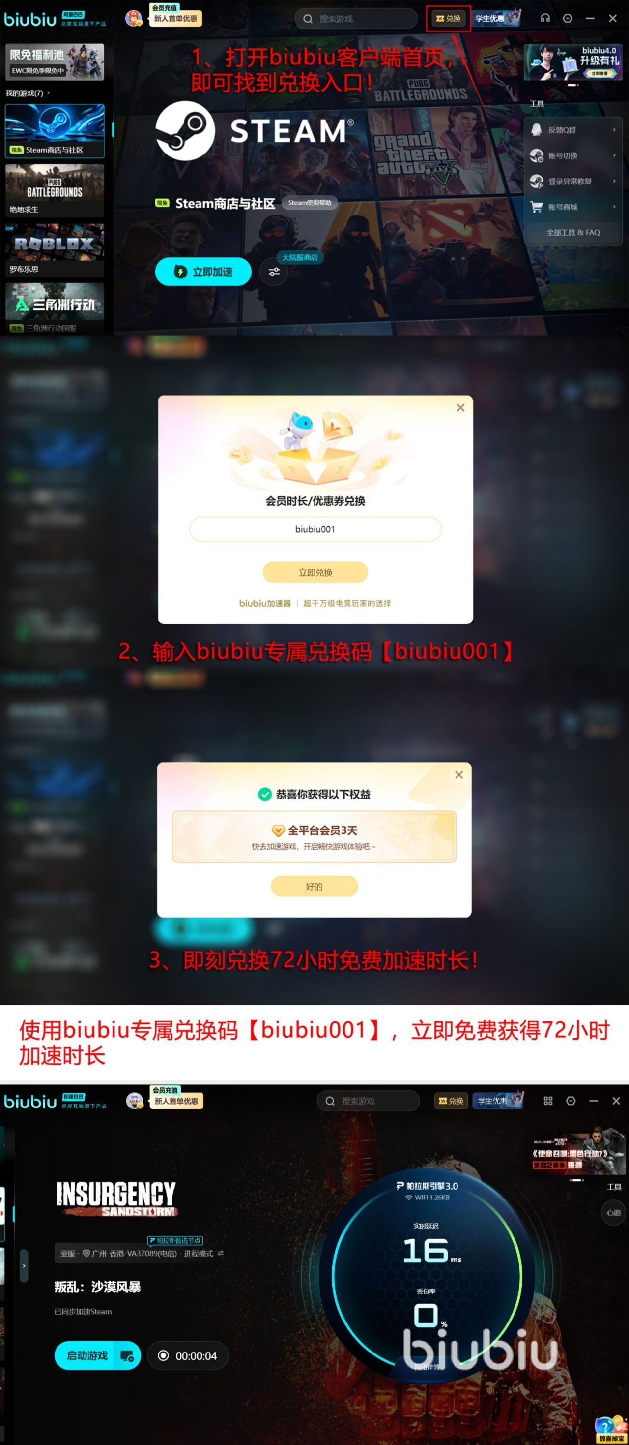 目前推送出一系列免费试用活动,新用户注册登录即可获得24小时免费加速时长,所有新老玩家可继续利用兑换码口令【biubiu001】直接领取三天免费加速福利,新用户可累计96小时免费加速,当免费福利结束之后,我们也可在超过3000多款限免专区当中寻找适合你的游戏,免费畅玩。