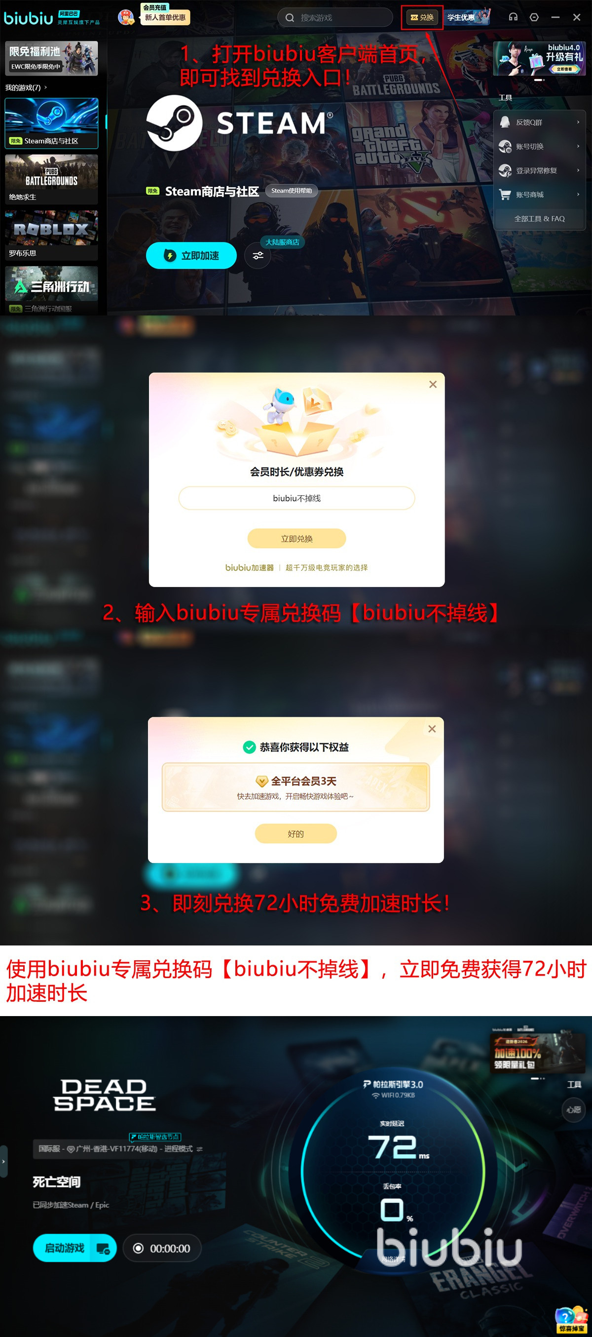 此时体验biubiu加速器,新用户专享厚礼即刻启程,注册成功之后自动获得首日24小时全功能免费试用权限,输入【biubiu不掉线】再额外获得72小时高级VIP加速时长,只需一个动作,新用户即可享受总计96小时的优质加速体验,零成本解决掉帧问题。