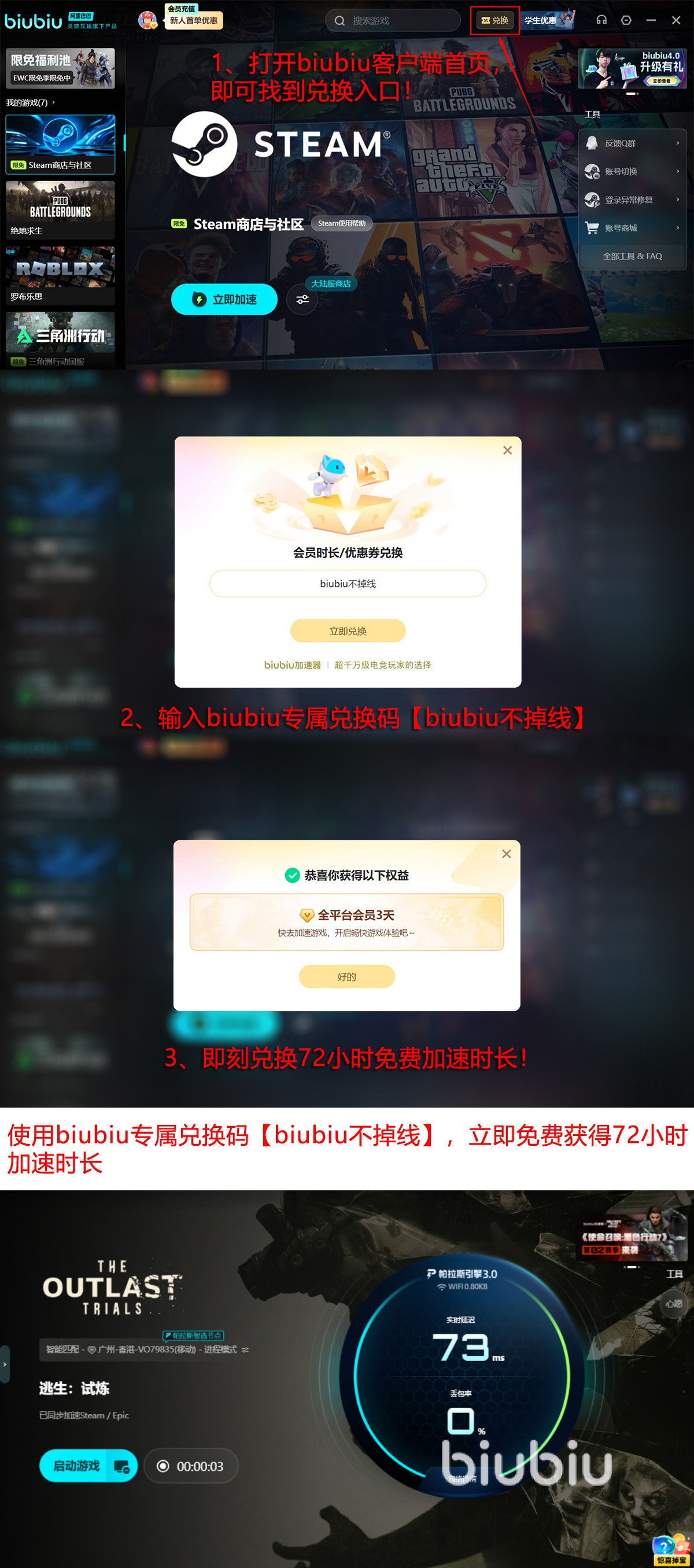 此时加入biubiu的新用户可获得丰厚的加速福利,注册即得首日24小时全功能免费试用,输入【biubiu不掉线】再获得72小时加速时长,双福利叠加,新用户可以畅享96小时的顶级加速体验,足以应对墨尔穆尔精神病院恐怖的关卡。