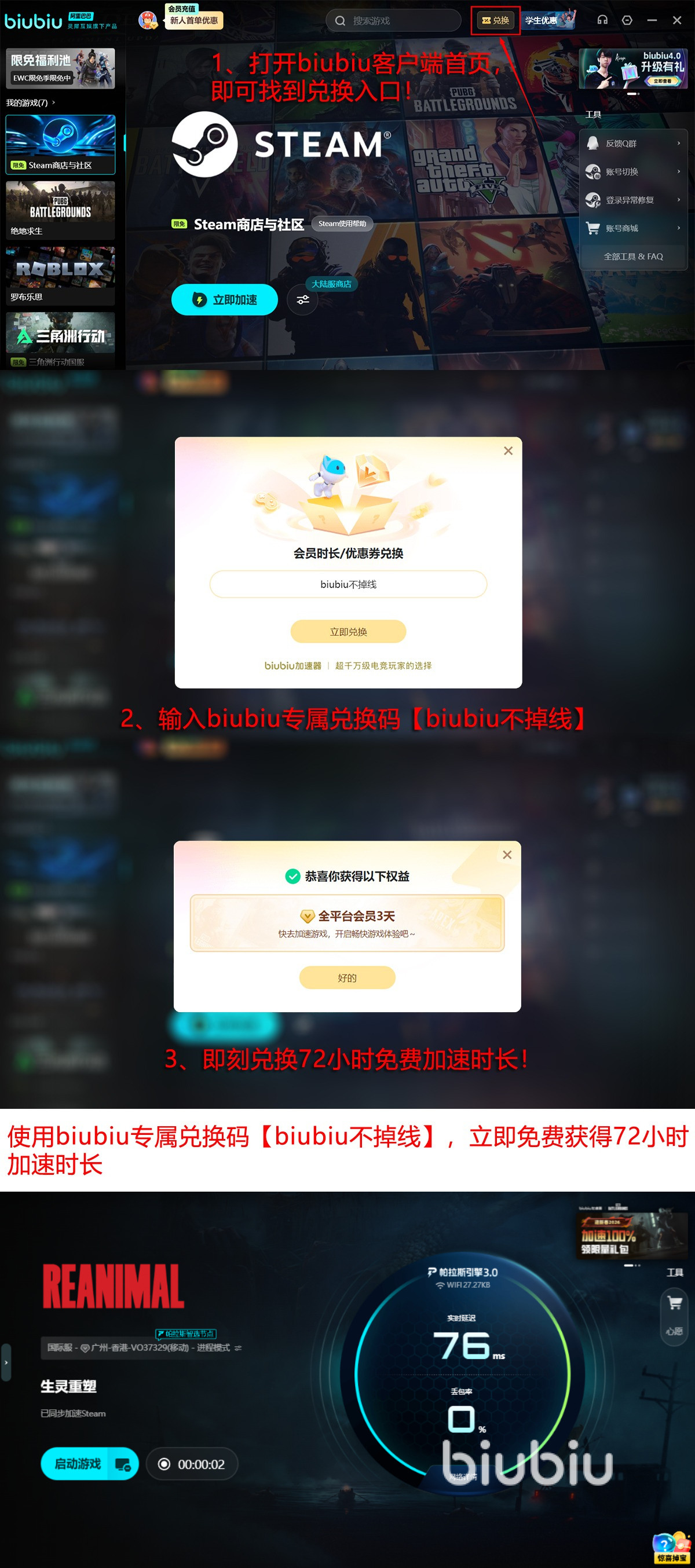 初次使用biubiu加速器的用户将会得到丰富的入门优惠:注册成功后会自动获得首日24小时全功能免费试用的资格,在输入【biubiu不掉线】之后再额外得到72小时全功能加速权限,新用户叠加福利之后共计可以享受长达四天的免费尊享体验,完全满足下载需求并可以进行初步的探索。