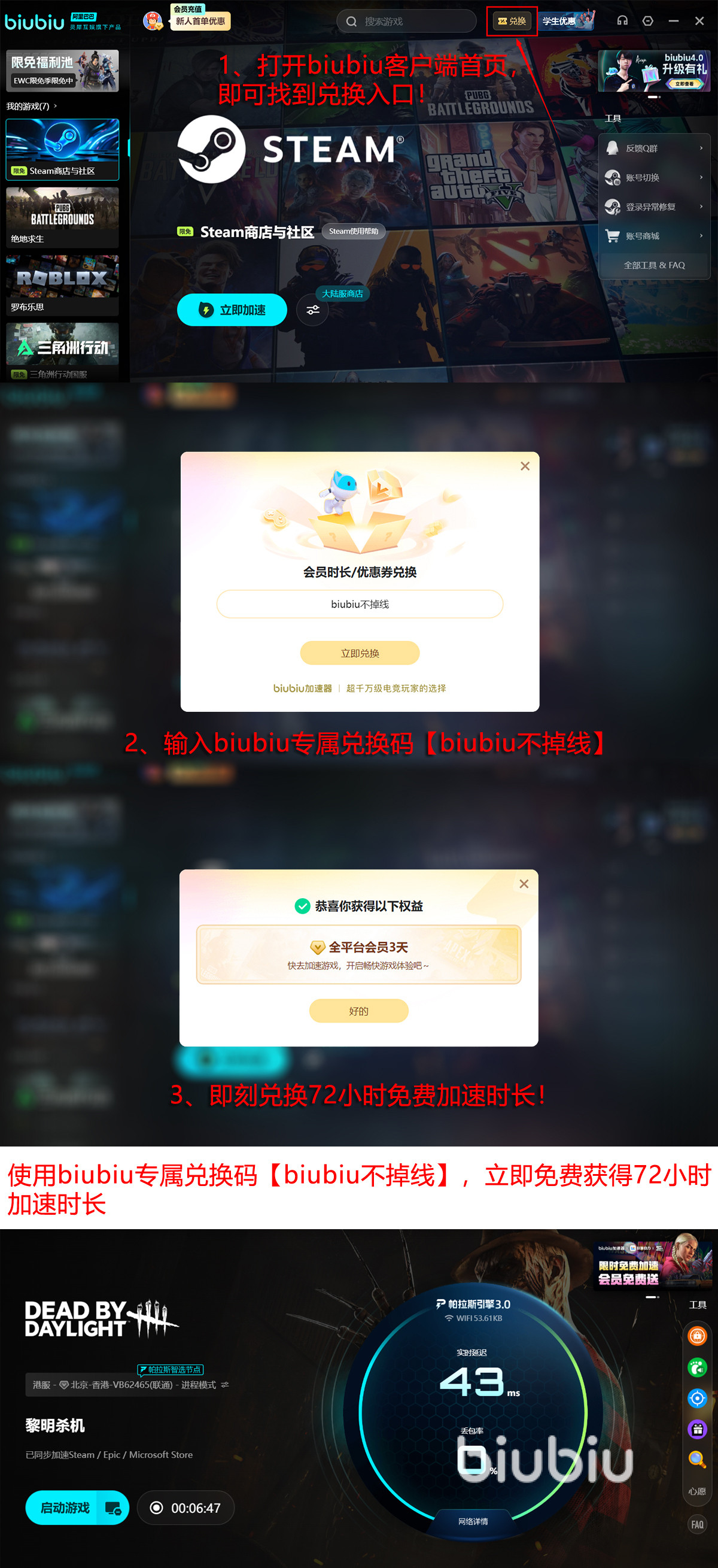 好多优惠已经开放了,抓紧来领取用吧。新人有专属的24h服务时间的,这些不够还能再去领,拿上【biubiu不掉线】的人实际上还有72h额外服务时间,叠加后就会给新用户送来免费的96h服务时长用了,好好珍惜这个福利,玩上多次对局。