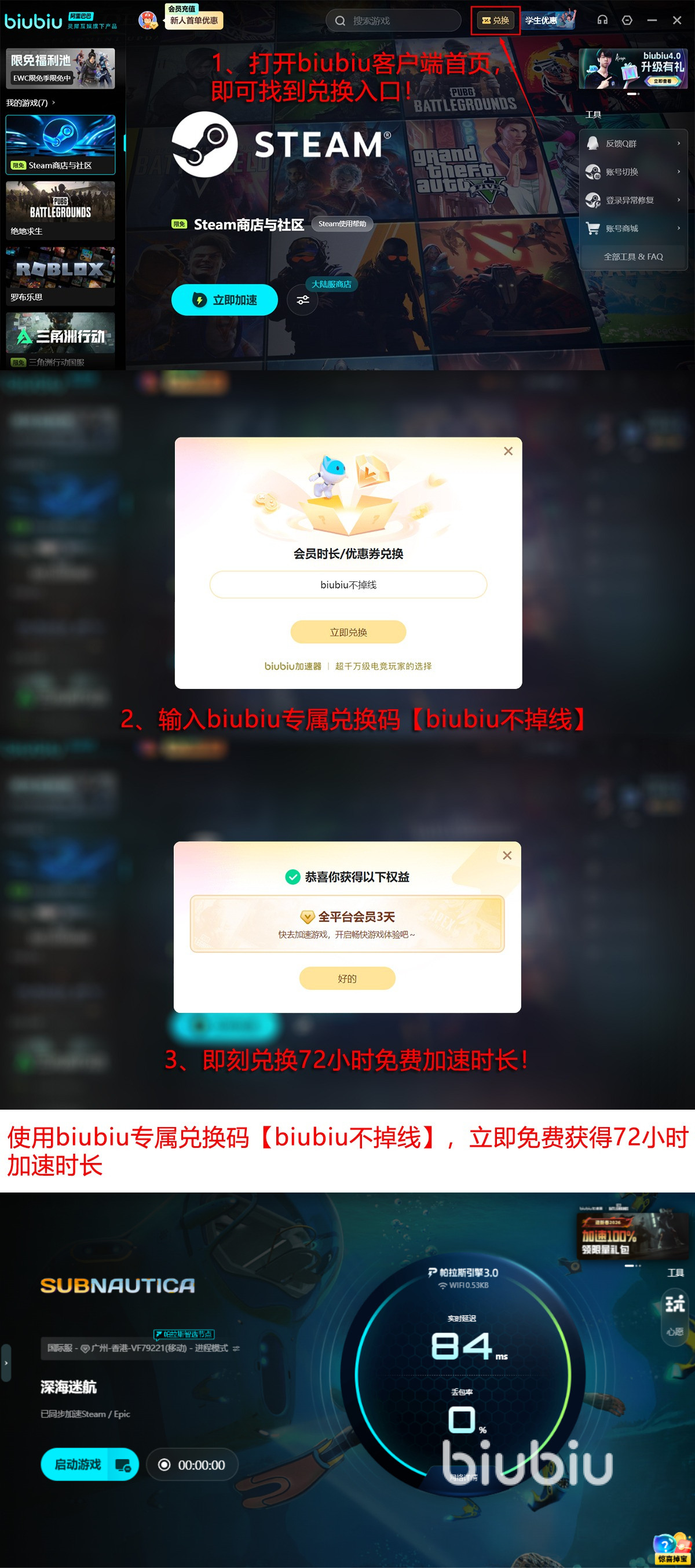 即刻行动,解锁biubiu超值福利,新用户注册后可获得首日24小时全功能免费试用权,输入【biubiu不掉线】再额外获得72小时免费时长。双福利叠加,一共96小时的极致加速体验,让你零成本体验到海底帧率飙升的快感。