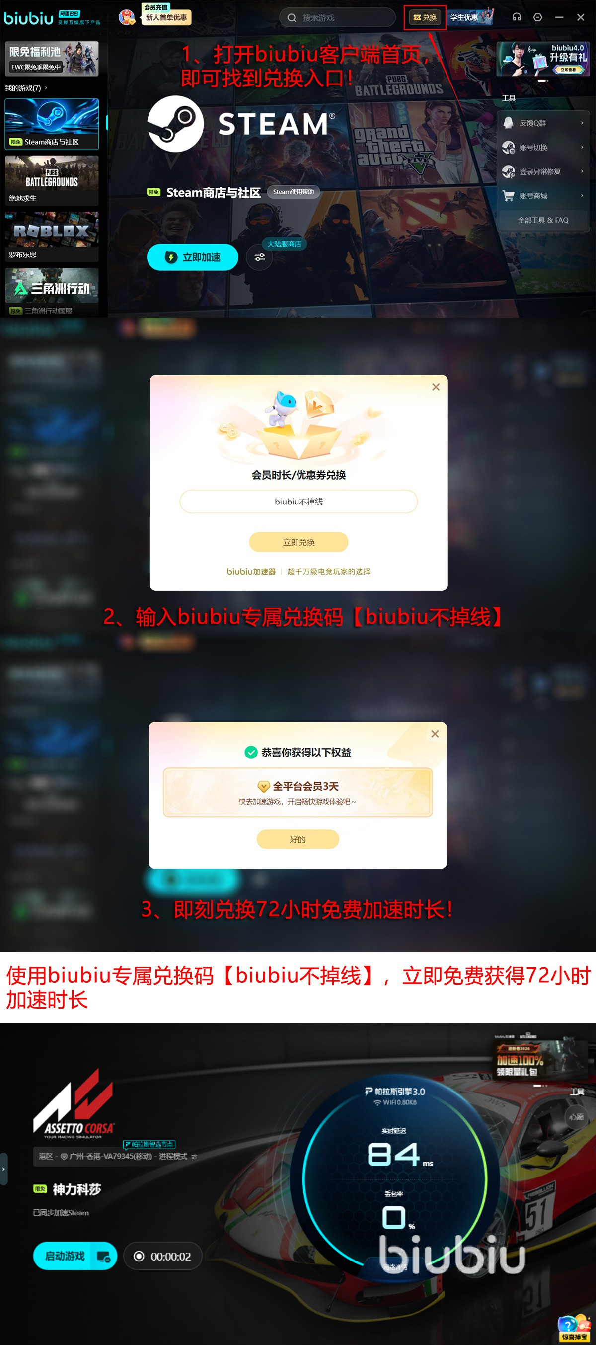 这时加入biubiu就能享受到丰厚的新客户礼遇:注册成功之后,会自动激活24小时全功能免费试用期,输入【biubiu不掉线】获得72小时加速时长。双福利叠加,新用户能获得总共96小时的优质加速服务,解决闪退的问题。