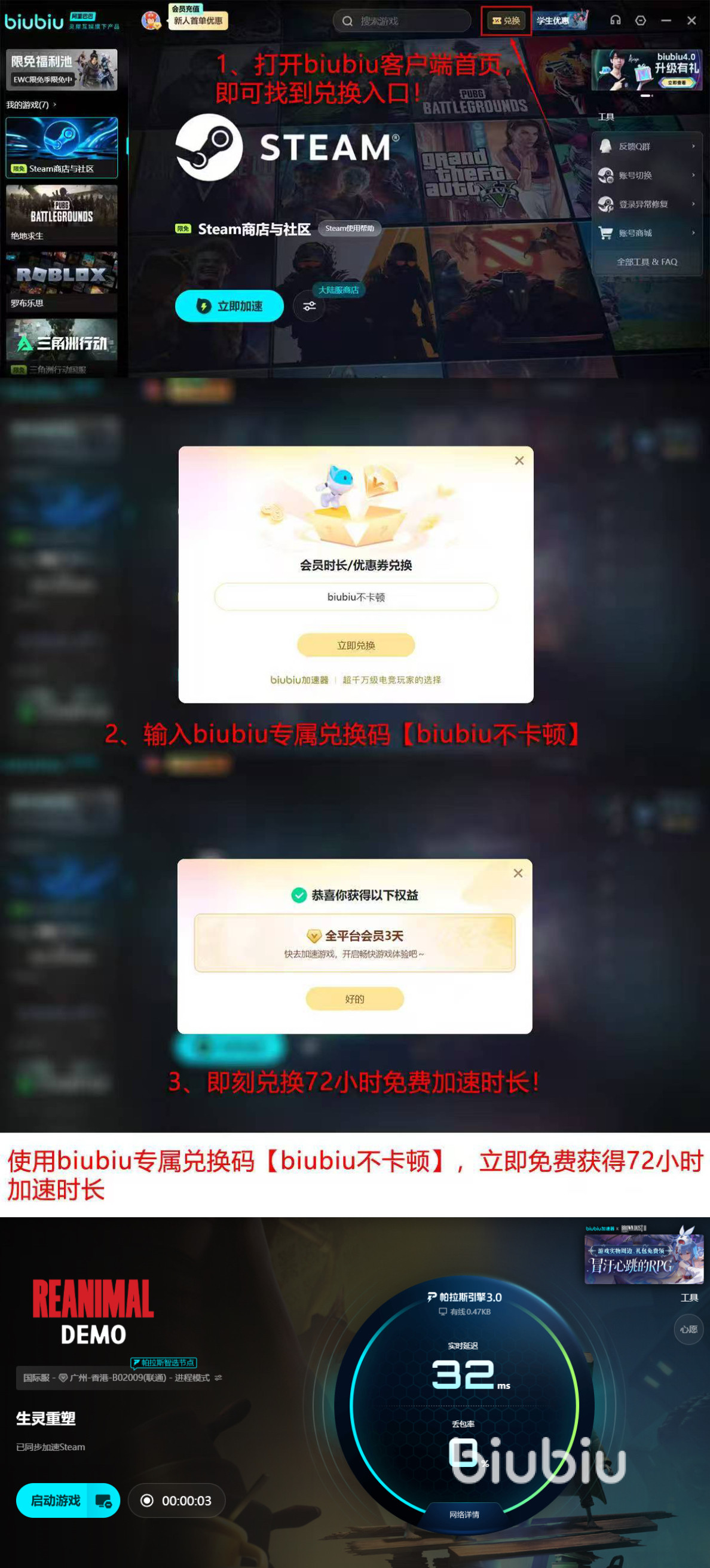 说到biubiu,还有几个点就不得不提,它是XDD小叮当代言的,而且还是PUBG冠军选手小叮当自己都在用的指定加速器,它还有自己独立自研的帕拉斯3.0引擎,加速的时候能智能选最优路径,比普通加速器稳多了,不用怕联机的时候出问题。新人福利也很到位,首次注册直接送24小时免费加速,输入兑换码【biubiu不卡顿】,还能再领72小时,加起来一共96小时,相当于四天免费使用权,刚接触的小伙伴可以先试试,好用再接着用。