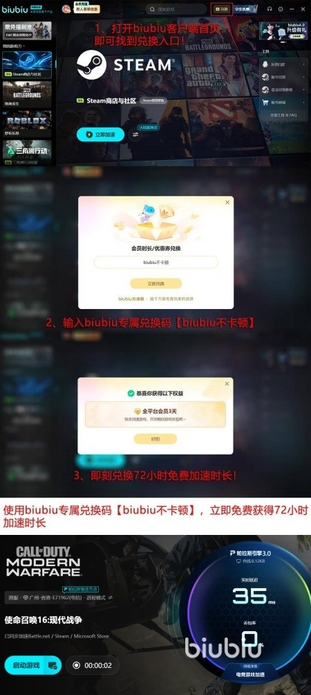 现阶段新人在初次进入到这款加速器的时候是有着不错的福利,可以享受到24小时的免费加速时间。在用了兑换码【biubiu不卡顿】之后还能够额外的获取到3天的免费加速时间。