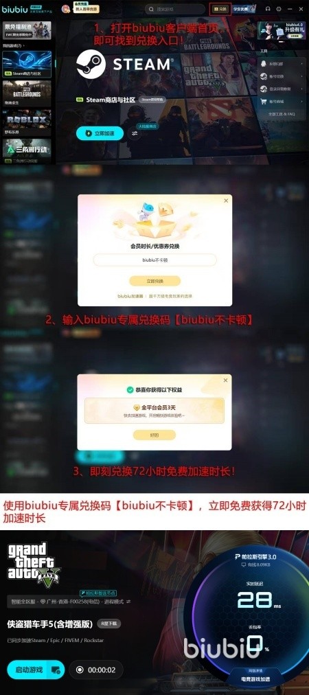 现在该加速器对于新人也有着不错的福利。目前新用户可以获取到24小时的免费加速时间,如果觉得不够用的话使用兑换码【biubiu不卡顿】则是可以获得额外的3天加速时间。