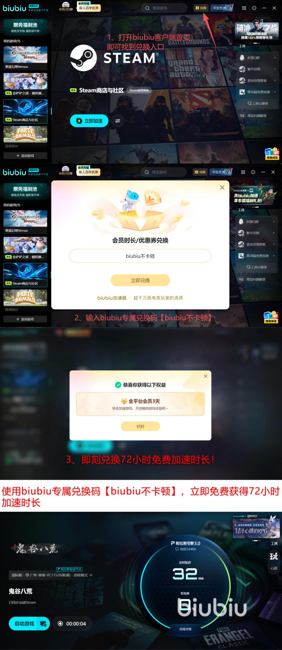 现在打开biubiu加速器,专属福利享不停!首次注册用户赠送24小时无条件加速,输入专属口令【biubiu不卡顿】,再额外赠送72小时优质加速时长,共计96小时免费加速权益,让鬼谷八荒中的修真探索更加丝滑流畅,助您更便捷的进行修行。