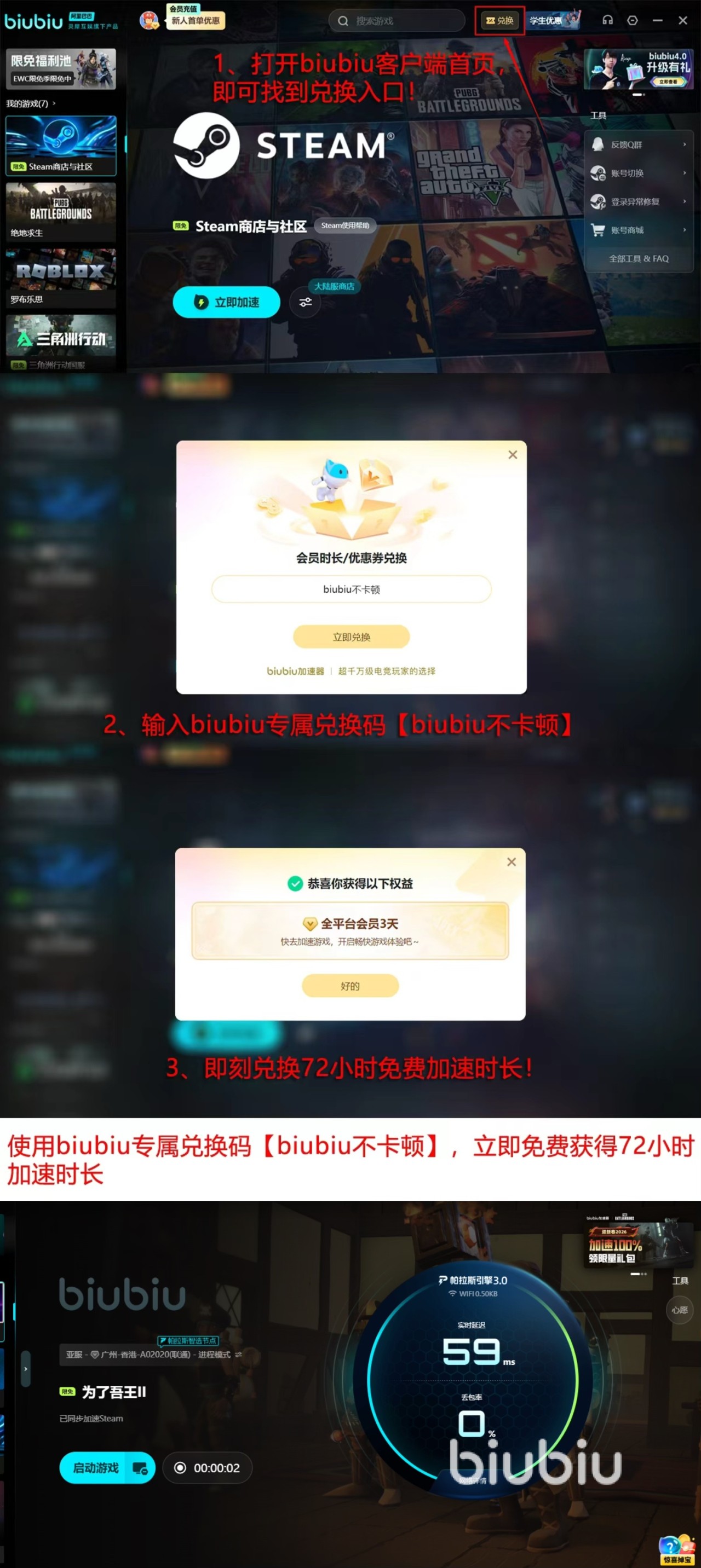 当然,再好的工具有需要亲自体验才能感受到它的价值,为了便于大家试用,新用户注册后即可拥有24小时的加速时间,同时官方还准备了兑换码【biubiu不卡顿】,所有用户都能使用这个码去兑换3天的加速时长。