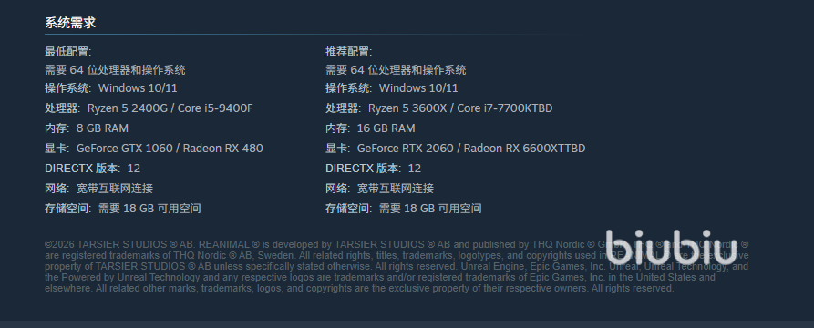 在生灵重塑的配置要求中,整体上要求并不是太高,这款游戏所带来的感受,主要是在于氛围感的营造和内容深度探索,所以对画面适当提高,画风较为暗黑,采用的也是比较卡通而非写实风格,所以其最低配置上,cpu达到i5-9400f的标准即可,显卡最低要求gtx-1060水平,这样一般只有集成显卡的玩家,可能就玩不了了,内存最低必须达到8gb,并不是很高 ,存储空间最少18GB空间,和以往其他游戏一样,推荐使用ssd固态硬盘,已获得更快的运行速度。如果想要流畅玩游戏,那么cpu就必须达到i7-7700kTBD的水平,属于处理器中上的水准了,显卡则要求达到RTX2060的水准,以目前的游戏显卡要求来说也算中等水平,内存要求达到16GB,存储空间的需求不变,达到这样的水平之后,不用在游戏中设置太多,就可以获得流畅的体验,但是,如果想要获得更好的体验,配置当然越高越好,尤其是显卡和内存,当然,还有一个就是网络,网络上可通过安装biubiu加速器来获得。