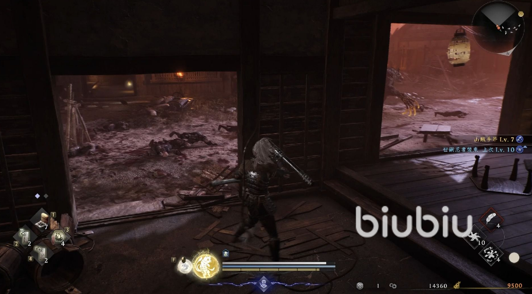 不顺逆用格挡也是一个不错的选择,通过两个鬼火分岔路后,从右侧梯子下行,击败迷雾骸武者,进入旁边房屋的宝箱内,此区域屋顶可通过细木跳跃到达,可能同时获得“忍者遗发”等稀有物品。