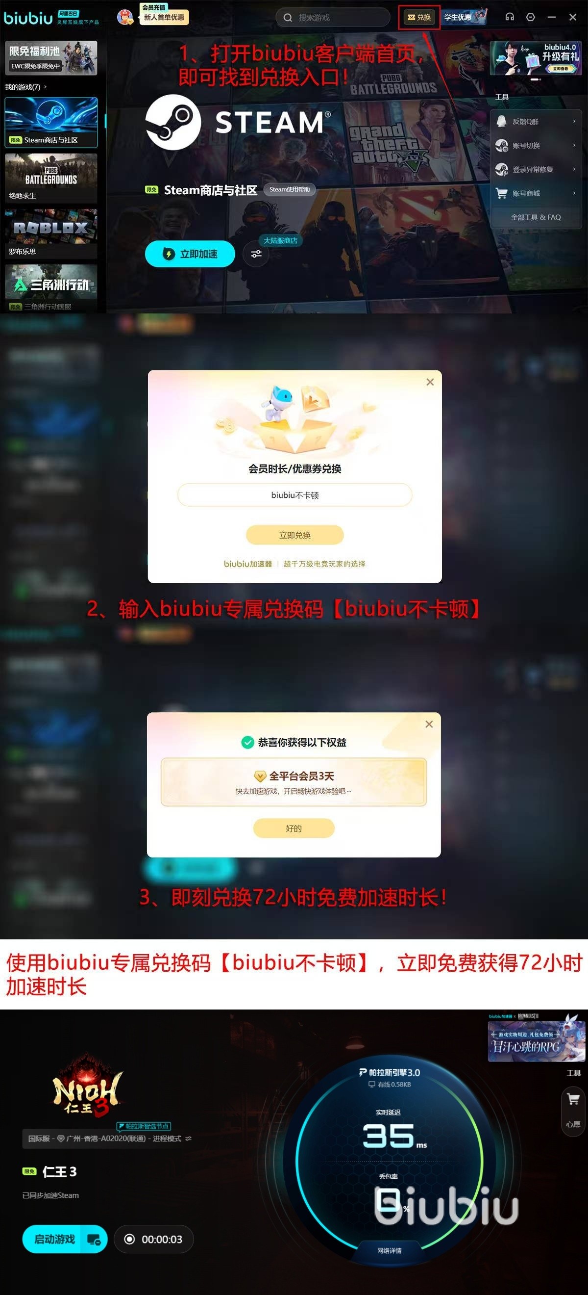考虑到目前有很多玩家是新用户,对于福利方面的了解不够透彻,而biubiu在这方面做的一直都是很出色的,现在新用户只要是首次登录就能成功让自己领取到为期24小时的加速机会,这样也是为了能让广大朋友们更好的进入体验,此外,广大小伙伴们还可主动去输入口令【biubiu不卡顿】,这样就能让自己成功的领取到72h的加速时长,让广大小伙伴们可以去轻松的感受低延迟且畅快的游戏体验,这点可是非常给力的哦。