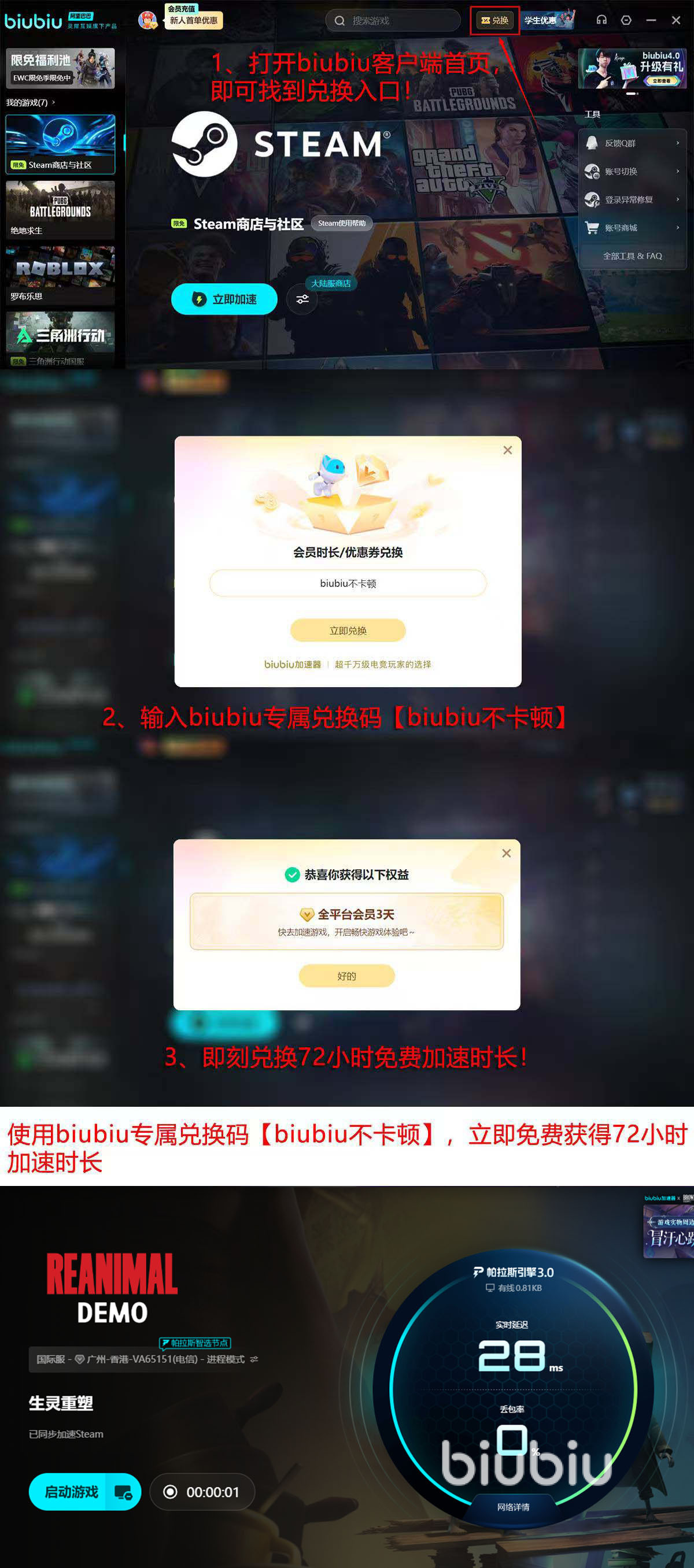 有对网络问题担忧的小伙伴,现在可领取免费测试几天,一是完成账号注册后,就能自动得到系统送的24小时,接着通过手动方式,打开首页“兑换”功能,使用口令【biubiu不卡顿】兑换到更多72小时 ,因此一个人目前总共能领取到96小时的免费体验时间。