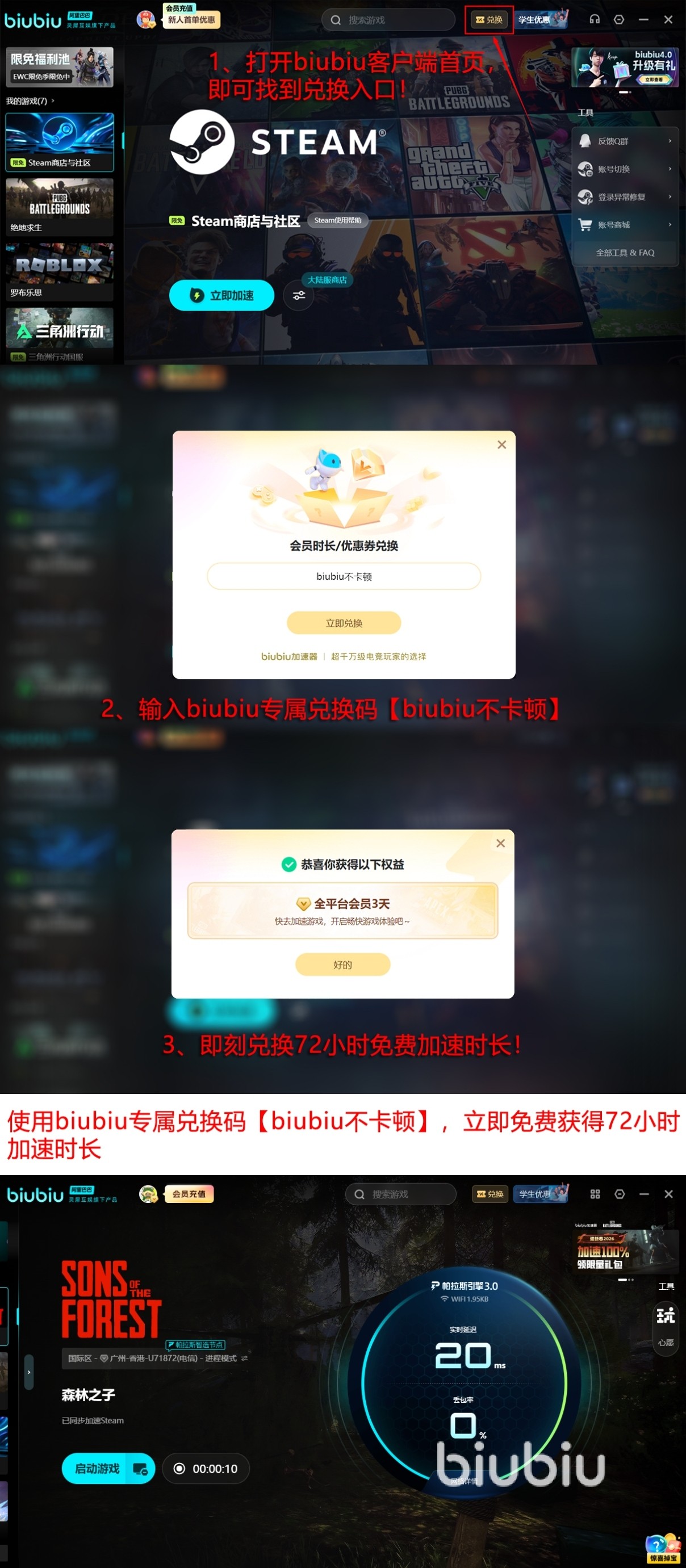 小编作为资深的《森林之子》玩家也和大家一样,在选择加速器的时候总是担心加速效果或者成本的问题。不过在biubiu加速器上这个问题就简单多了~因为biubiu早就给大家的新手福利准备好了:首次注册的朋友能免费获得24小时免费加速时长,并且输入全部用户专属的兑换码【biubiu不卡顿】还能再领取多72小时的免费体验机会,也是说两项叠加新人最高可以享受96小时的免费加速游戏服务!兑换流程很简单快捷,有顾虑的玩家伙伴完全可以在免费体验过后再决定是否续费呢,再也不用担心踩雷了~
