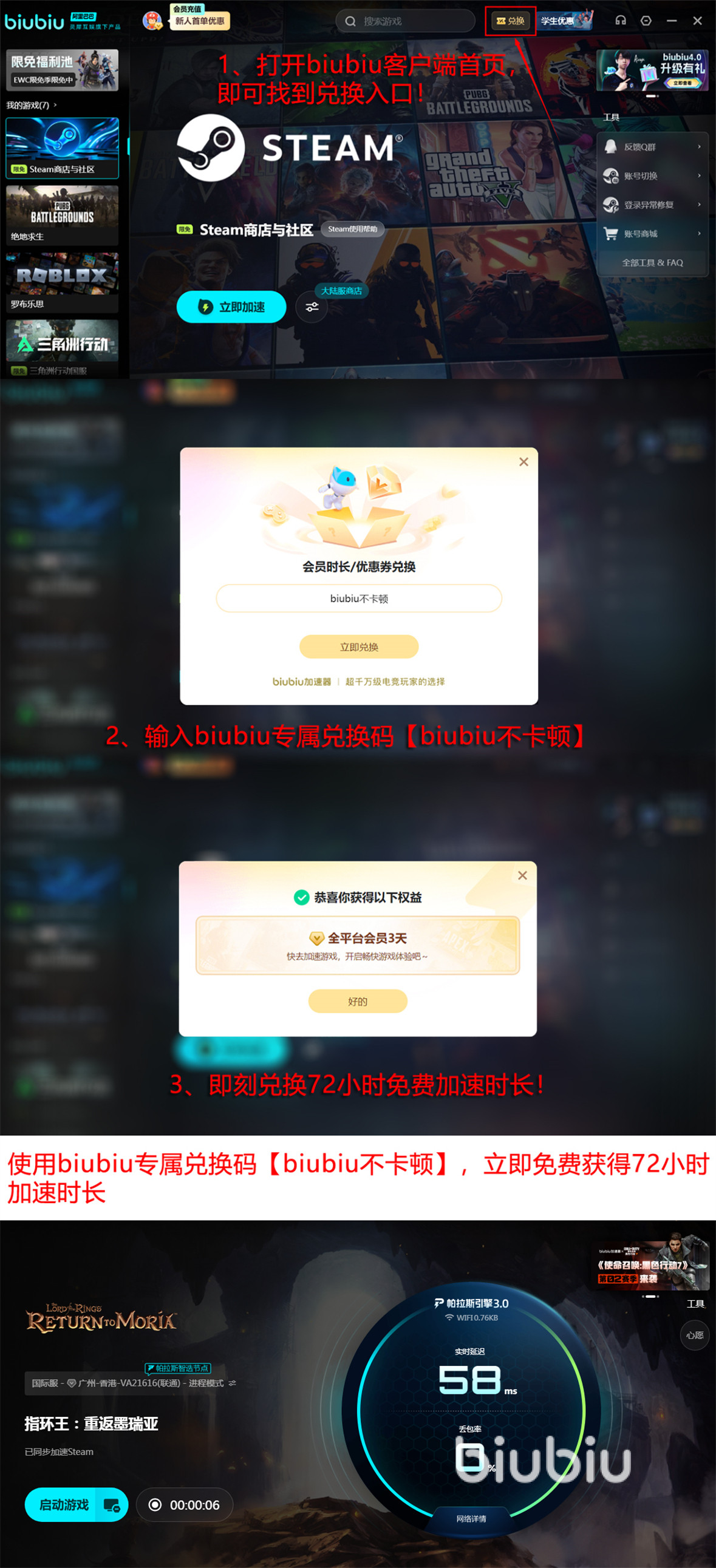 虽然biubiu采用的是会员加速模式,需要成为会员才能有最佳效果,不过现在有新注册账号赠送24小时加速时间的福利,让新人先来感受一下效果。还有一项活动是通过兑换码【biubiu不卡顿】兑换72小时加速时间,每个号都能用一次。这就相当于给新人一共提供了96小时的加速时间,绝对不用担心性能无法满足要求的问题了。