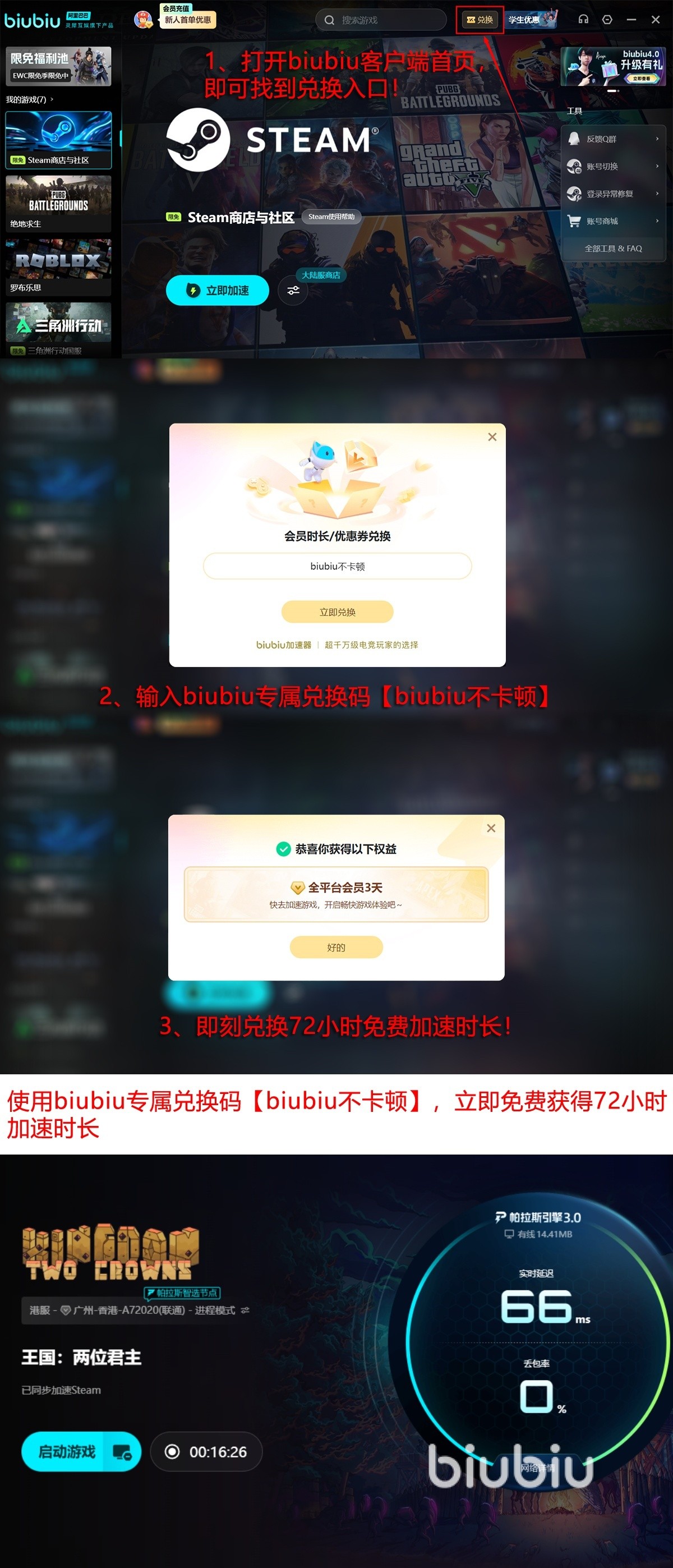 另外biubiu还拥有很多的福利等待大家领取,新用户可以在注册之后获取24小时的免费加速时长,如果大家觉得24小时过短的话,还可以同步输入兑换口令【biubiu不卡顿】再额外领取3天的免费加速机会。将两个时长全部领取之后,玩家们就能拥有免费96小时体验时长体验机会,让玩家们零门槛的去感受这个平台的加速效果。