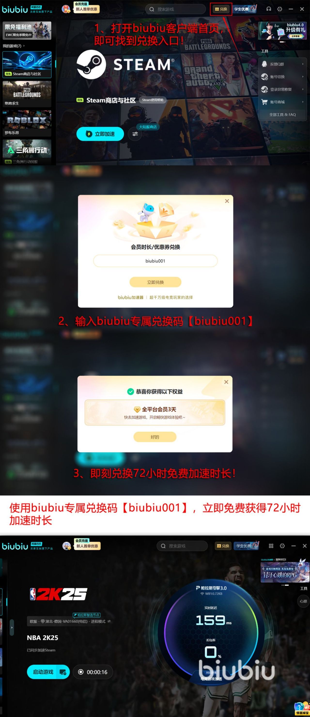 用极简单的页面设计,没有特别复杂的操作,既便捷又全面,其次依托于阿里巴巴灵犀互娱技术的加持,还采用自行研发的帕拉斯3.0引擎技术,早也得到了绝地求生冠军小叮当的极力推荐,还为此成为代言人,在游戏加速的领域中是综合的优质选择,还凭借着零门槛的免费策略,得到很多用户的一致好评,包括新人只要注册之后就可拥有24小时。同时输入【biubiu001】还能额外获得三天的免费加速,累积下来就可达到96小时,呈现出持续加速时长,降低了大家的使用门槛。