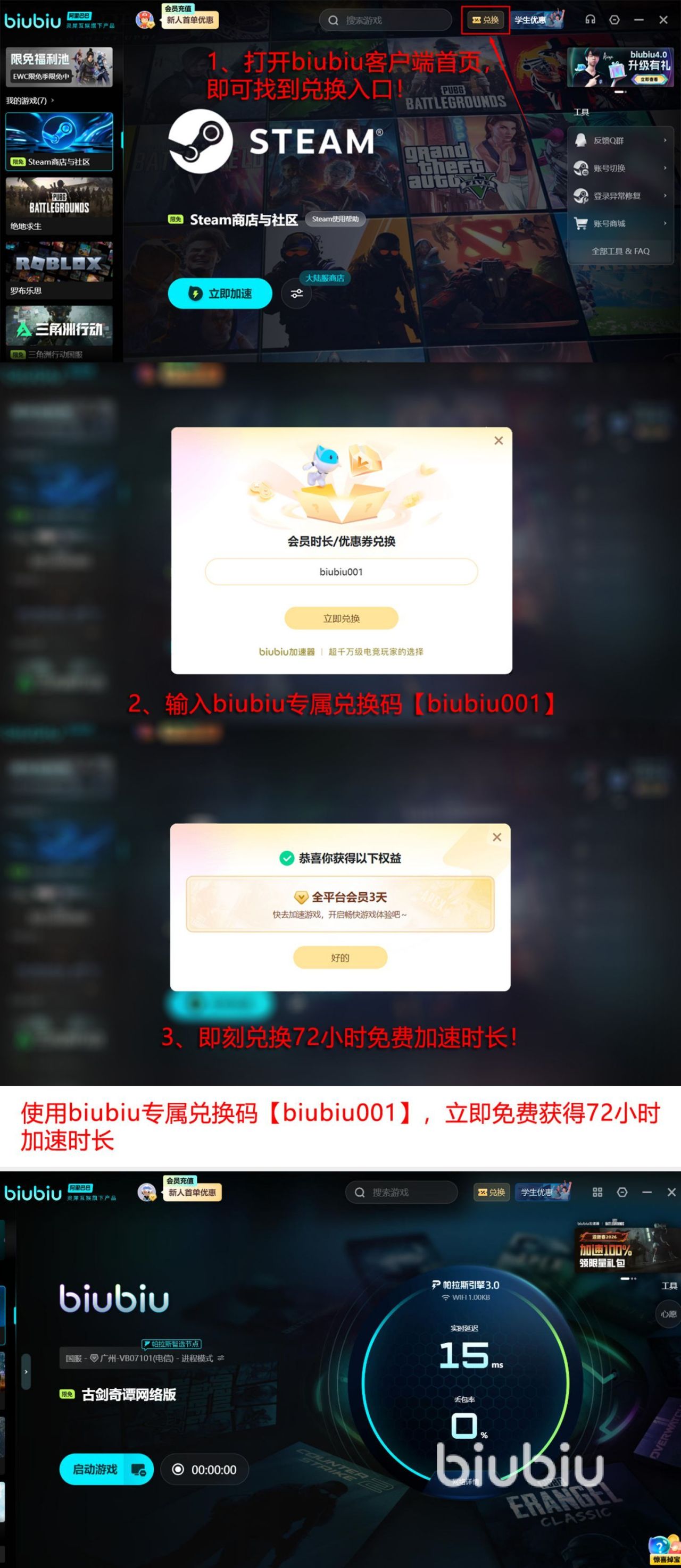当前所有新老用户全部都可以参与官方推送的惊喜福利,使用兑换码【biubiu001】即可获得72小时免费加速时长,长达三天的时间,可自由探索并体验,新用户注册登录之后,额外获得24小时免费加速。加送福利,新用户能够将两种福利叠加至96小时。