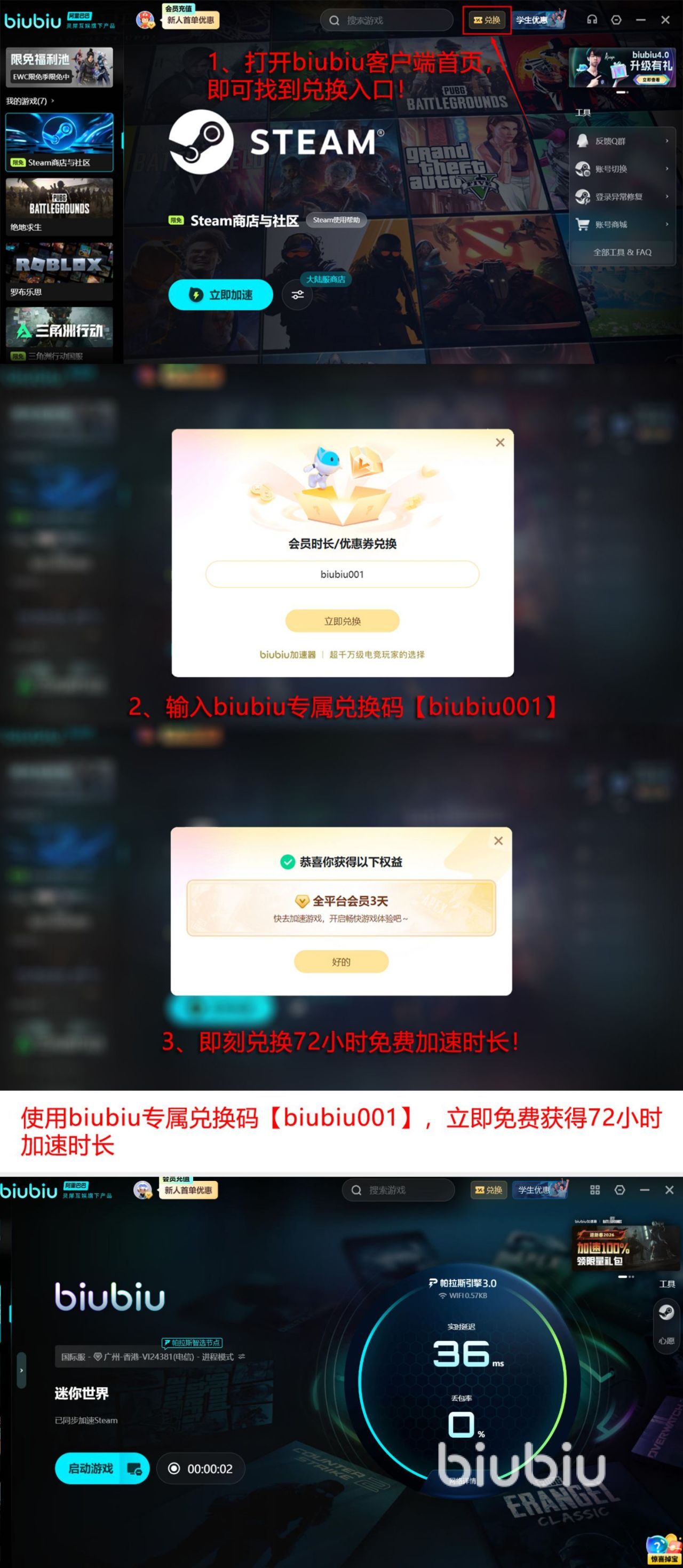 此加速器在整个行业当中实力是非常雄厚的,也是首屈一指,因为依托于阿里巴巴灵犀互娱旗下的技术,还有就是先进的帕拉斯3.0引擎技术的烘托加持,让大家体验时更加轻松又流畅。还有大量的福利等大家领取。只要第首次注册的用户会立即拥有24小时的加速时长,使用完之后也可利用专属的口令【biubiu001】,再额外获得三天的免费时长。这96个小时就可以畅通无忧,让大家体验不同的游戏,而且在周末开黑时没有任何忧虑。