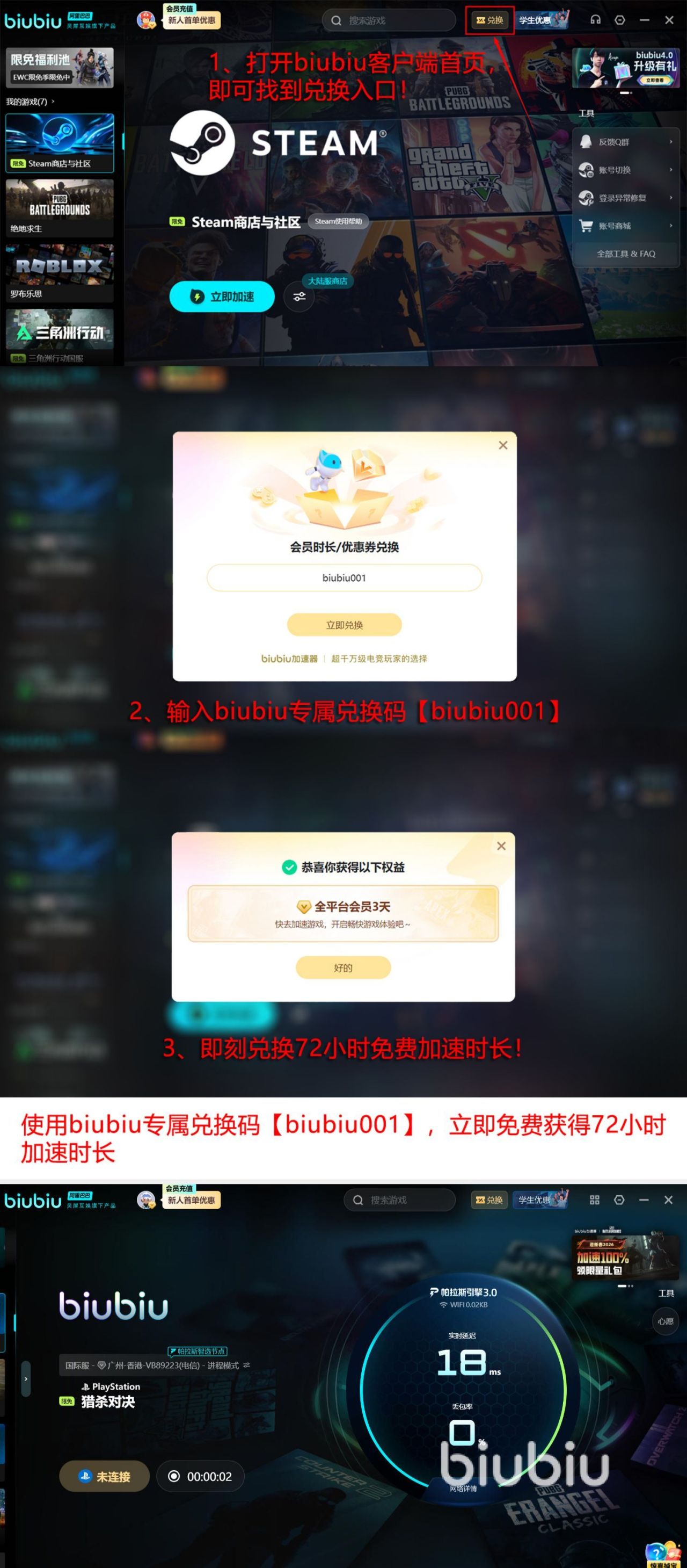 所有新用户只要登录账号完成实名认证之后,即可获得24小时免费加速时长,新老玩家也可使用【biubiu001】这个口令在兑换界面当中,成功领取三天免费加速福利,意味着所有新用户都可获得长达4天的免费加速时长,在这4天范围内可以任意选择你喜欢的完成加速运行。