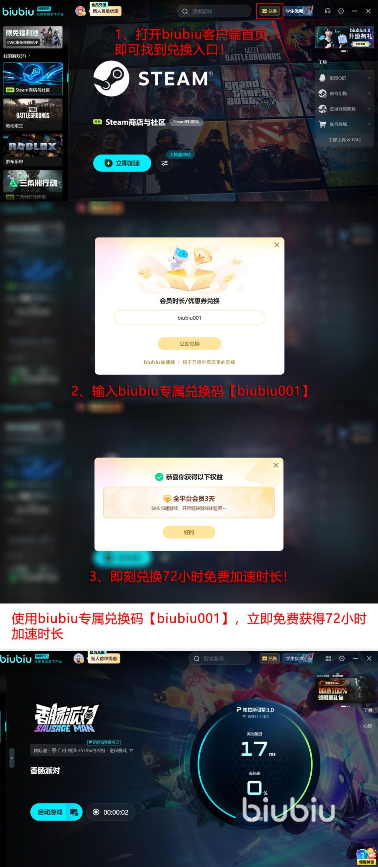 这款相当专业的加速应用,支持全球200多个地区游戏加速,具有智能导航技术,毫秒级解决拥堵路段,在加速的过程当中并不需要手动操作,可智能切换最优专线,甚至也会选择距离自己最近的服务器快速连接。如果你是刚接触的新用户,那么即可获得24小时免费加速时长,针对于所有新老玩家可使用兑换码【biubiu001】获得三天免费加速福利,新用户参与两项活动之后,将免费时长叠加至96小时。