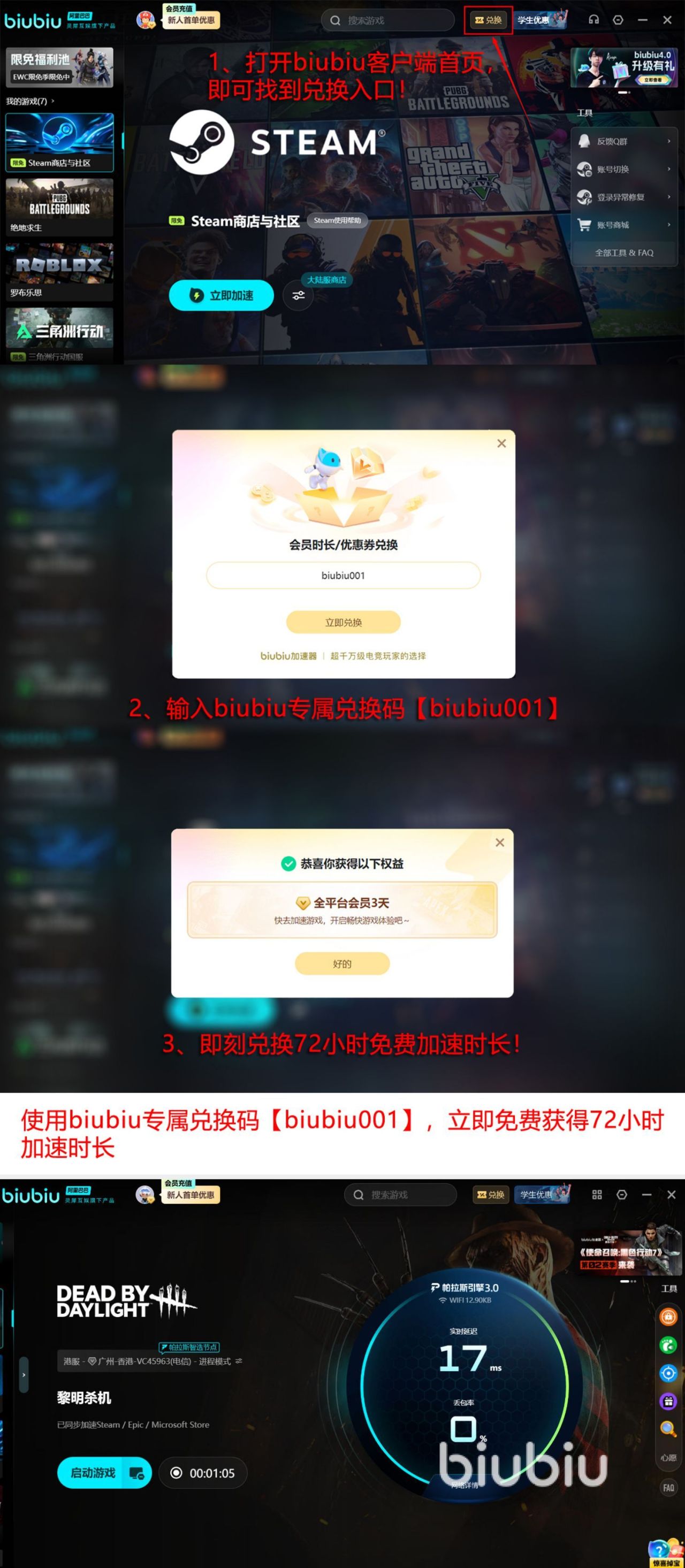 当前所有新老用户都可领取免费试用福利,中在主界面当中寻找到兑换板块输入口令【biubiu001】则即可成功获得72小时免费加速时长,长达三天的时间内可任意搜索游戏也并自由加速。新用户的话可以注册获得24小时免费加速时长,能够累积96小时。