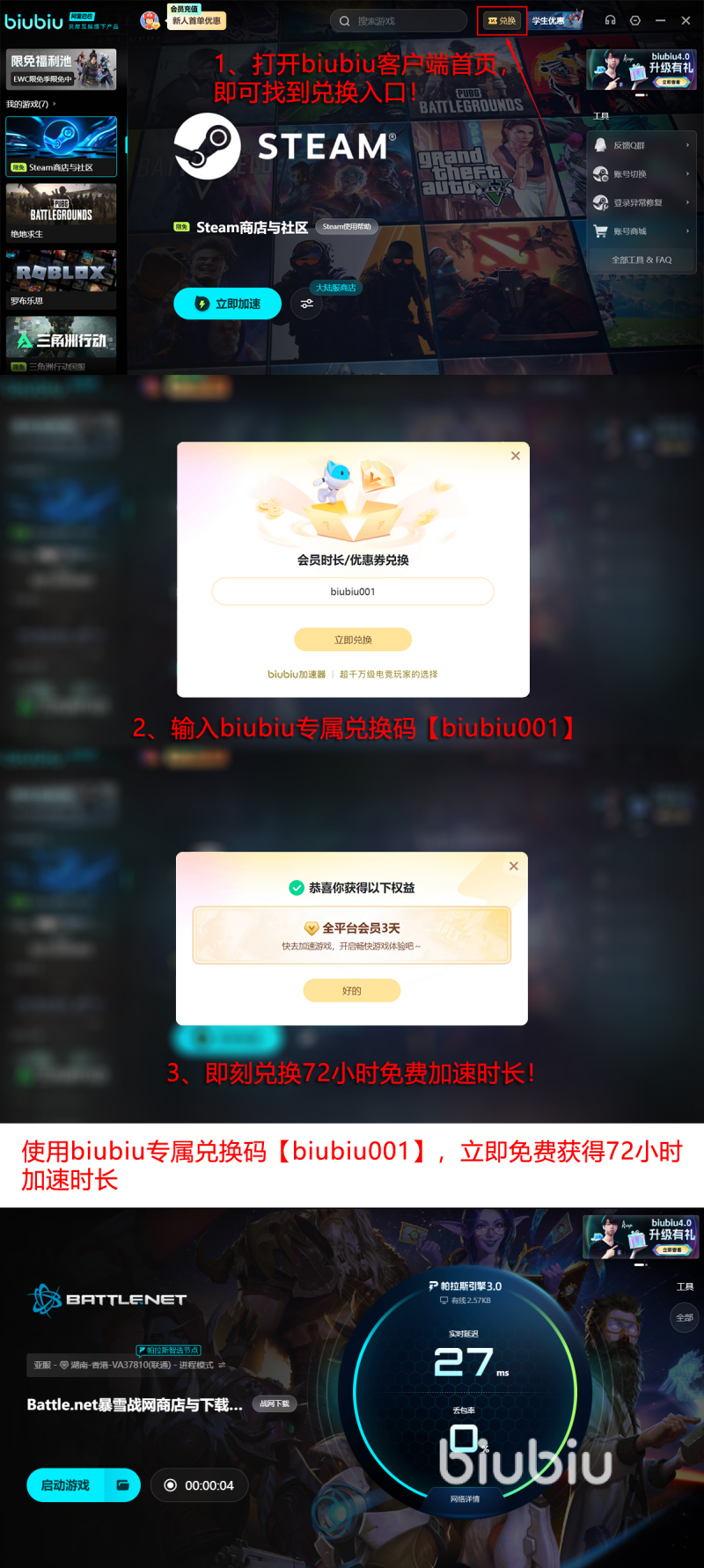 在硬核实力的背后,其实就是多方的认可。biubiu加速器作为阿里巴巴灵犀互娱大厂技术的一款加速器。早就已经得到了PUBG冠军选手小叮当(XDD)的青睐,成为专属的指定加速器。专业级别的性能就可以得到职业赛场的认证,在福利这一方面也是很不错的。新用户在注册之后就能解锁24小时加速时长,如果觉得这个时间不足够,还可以使用兑换码【biubiu001】额外延长3天的时间。新老用户都是可以通用的,新用户搭载两种方法,就可以免费长达96小时。