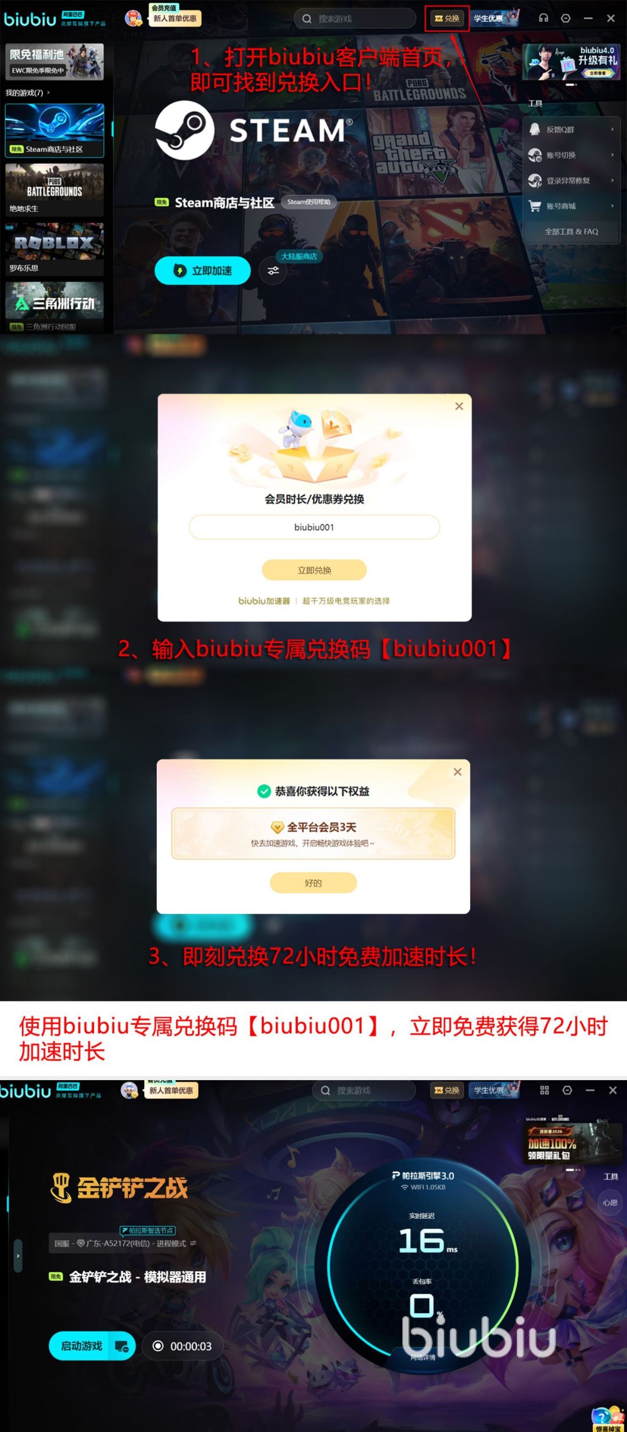 因为biubiu加速器,它不仅是平民玩家都可以使用的,能够给大家带来电竞专线,以及动态多线,除此之外,还有多路发包升级,以及弱网对抗升级。早就已经成为了PUBG冠军选手小叮当的大力推荐,甚至就连pero战队训练时都指定这款。它除了依靠阿里巴巴灵犀互娱这样的大企业,还有专业的团队所打造的帕拉斯3.0引擎,能够让大家在畅玩各种竞技类型游戏的时候,感受顺畅的操作以及平滑的动作画面显示。如今新老用户通过输入正确口令【biubiu001】即可以免费加速三天,新用户只要注册登录就能获得24小时,两种方法一起的话,一共可免费加速96小时,让所有的玩家都能凭借着如今的福利,0元享受加速器所带来的绝佳游戏体验。