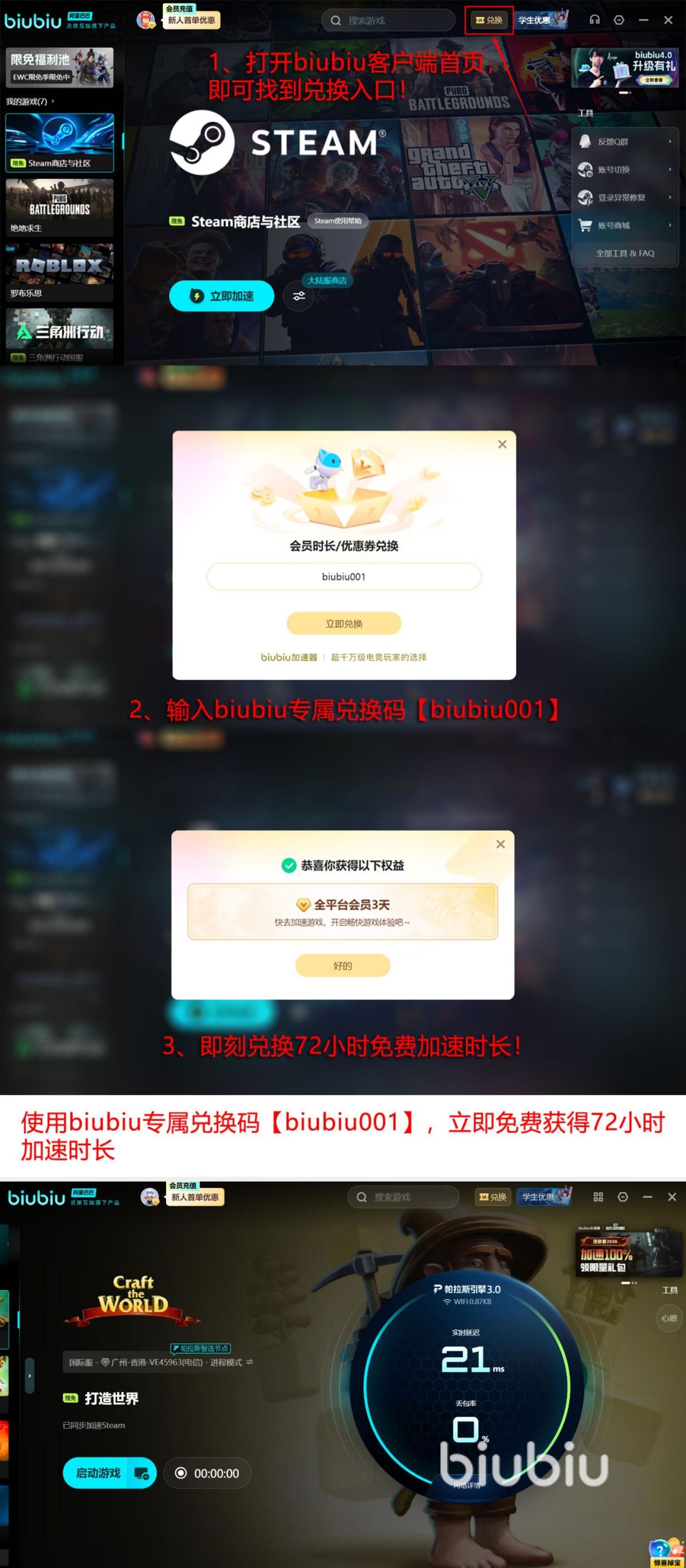 除了上方介绍的游戏,如果出现了闪退的问题,可以应用介绍的加速工具来解决,它的实力也是非常强的,背靠阿里巴巴灵犀互娱大厂的技术,同时还有专业团队自研的帕拉斯3.0引擎,即使是pero这种专业的竞技战队,也在训练的时候指定这一款加速器,足以证明它是非常好用的。如果也想要体验的话,如今还有很好的福利,新用户注册以后就能够获得免费加速24小时。新老用户的话,还可以通过输入口令【biubiu001】的方式免费加速三天,新用户利用这两种方式,一共可免费加速96小时。