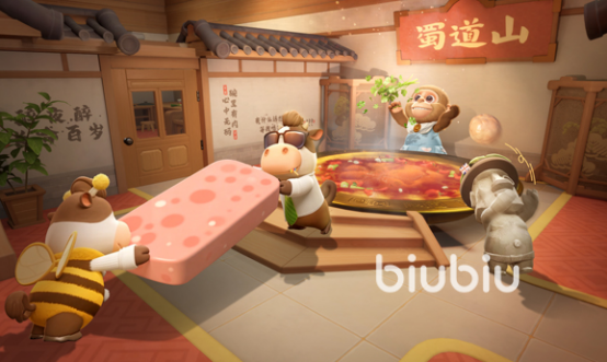 “火锅之王”模式深度还原川渝饮食文化语境,玩家操控拟人化动物角色围炉竞技,在沸腾锅底与食材道具间展开策略性对抗;“双人乘骑”则引入协同操控机制,在齐天大圣主题场景中驾驭雪橇穿越冰原,考验默契配合。所有玩法均围绕“零压力、高传播、易上手”原则打磨,兼顾单人休闲与多人共创需求。