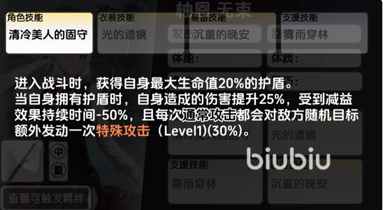 柚恩的核心优势集中于“护盾驱动型输出”模型。其主动技能【清冷美人的固守】构成攻防一体的基础:入场即获得相当于最大生命值20%的初始护盾;护盾存在期间,角色获得25%全伤害提升,并免疫50%减益效果。尤为关键的是,该技能使每次普通攻击均能额外触发一次对随机敌方目标的特殊伤害,彻底规避传统副C依赖大招循环的输出断档问题,实现高频普攻下的稳定DPS释放。