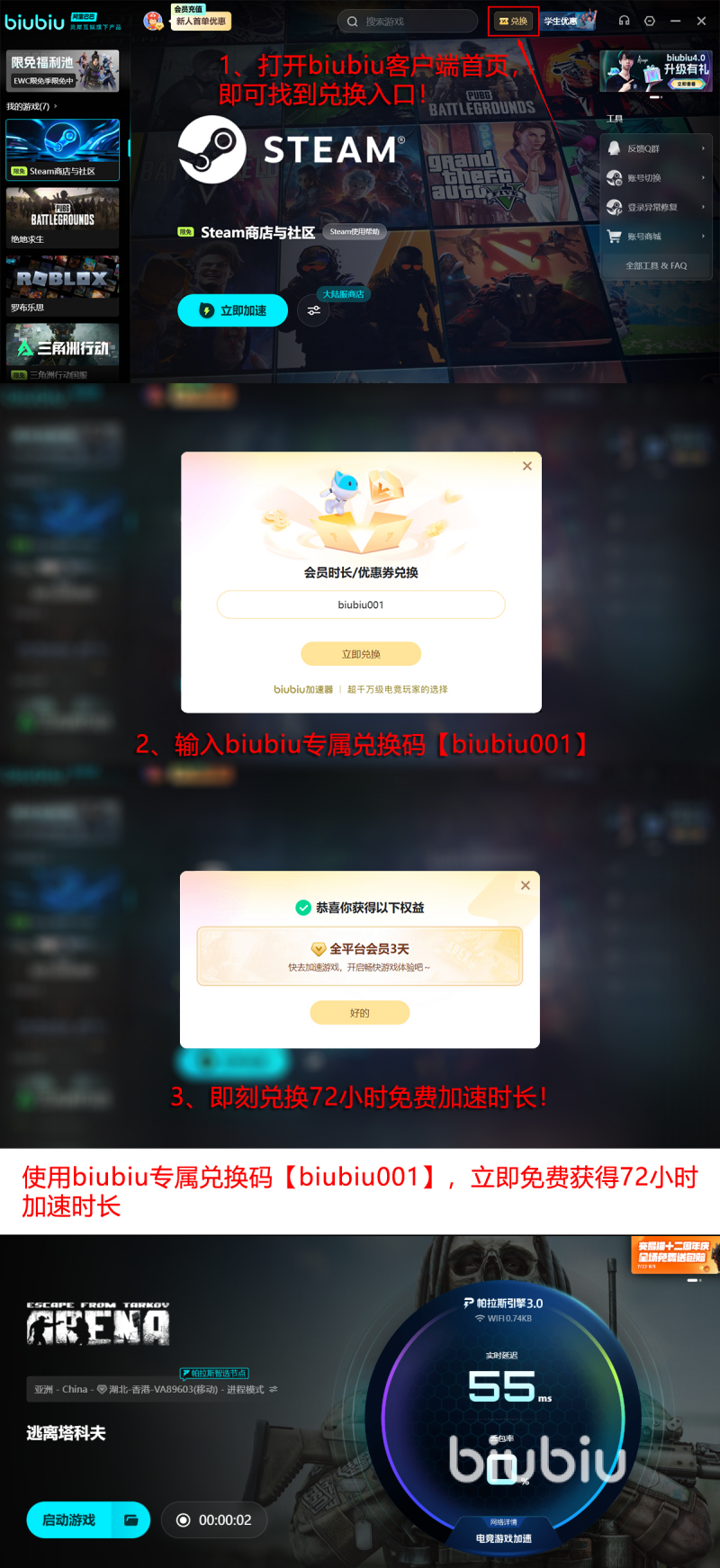 biubiu加速器所拥有的优势,早就已经被大家认可,拥有较好的口碑。作为一款PUBG冠军选手 XDD(小叮当)指定加速器,陪伴众多职业选手征战顶级赛场,通过零波动的网络表现,让选手们就可以发挥更好的实力。还有帕拉斯3.0引擎,可以在加速的过程实现精准调控,就算遇到一些高负载的游戏,也无需担心。如今这款游戏还有免费福利可以领取,让玩家就能尽情的享受顺畅的体验。所有的用户都可以使用兑换码【biubiu001】领取3天的加速时长。对于新用户而言,可以在3天的基础上,还享受一个24小时的免费福利。搭配兑换码一起使用,就能享受长达96小时的免费时长,彻底解决游戏闪退的烦恼。