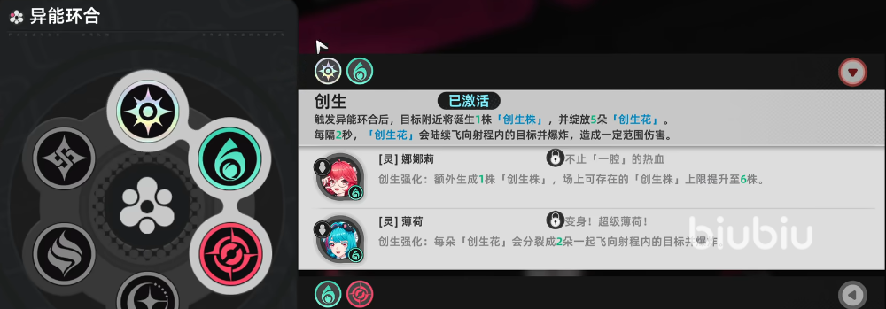 当前开放的环合天赋共六类:创生、覆纹、浊燃、失谐、黯星、浸染。每类天赋对应专属的环合增强逻辑,且与特定角色组合存在强绑定关系。例如,“创生”天赋并非通用型增益,其生效前提为队伍主C为娜娜莉(光属性),副C为薄荷(灵属性)。该配置下,战斗中可稳定生成【创生株】,并随环合值增长逐步绽放为【创生花】,从而提升全队环合技能的持续时间与附加效果强度。