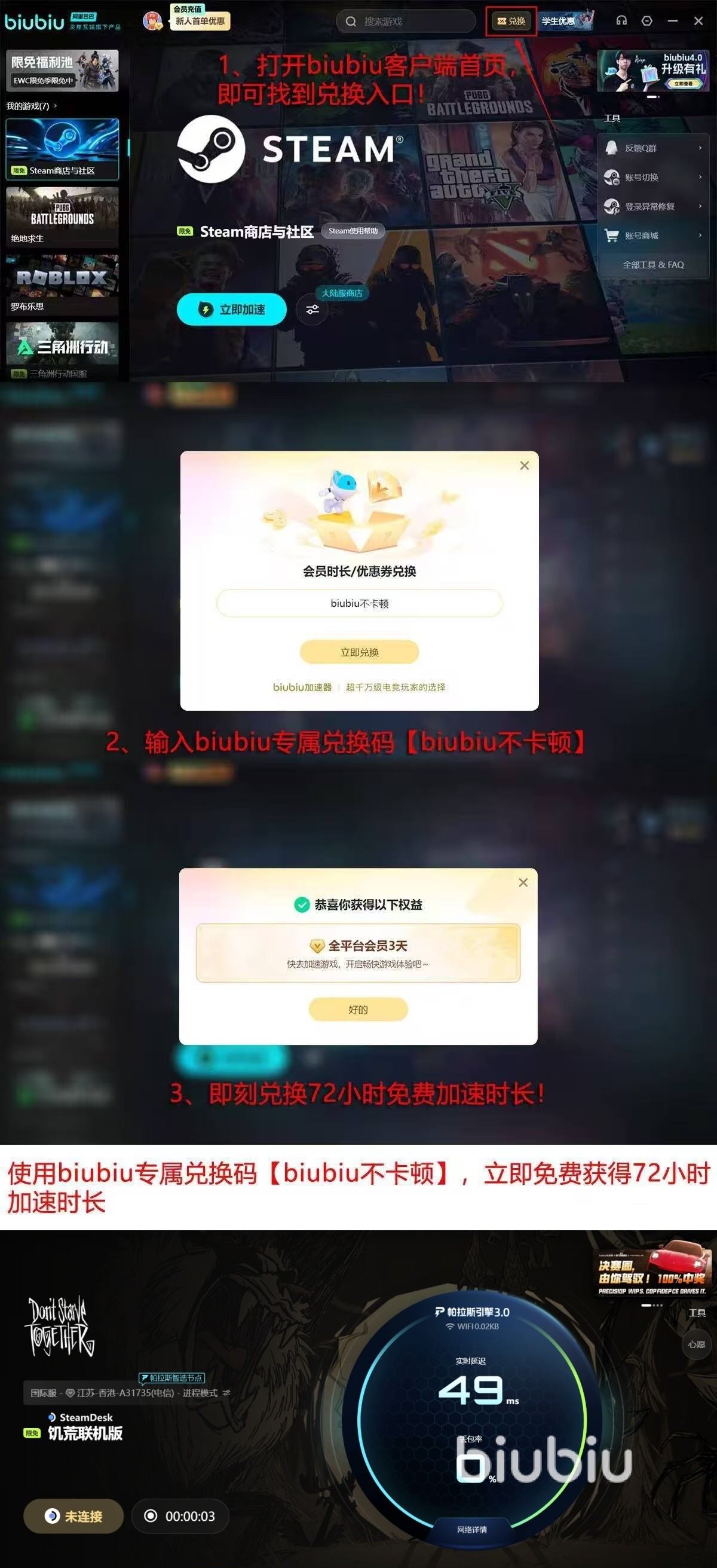 使用成本方面,biubiu还非常注重用户体验,新用户的第一次尝试就可以拥有24h免费加速时间,另外输入【biubiu不卡顿】这个口令,还能额外得到三天的继续免费体验时间。总体合计是96个小时大家可以任意畅玩。此外如果体验不错的话,在校大学生通过学信网认证,更可解锁长期专属优惠,大幅降低高质量联机门槛。