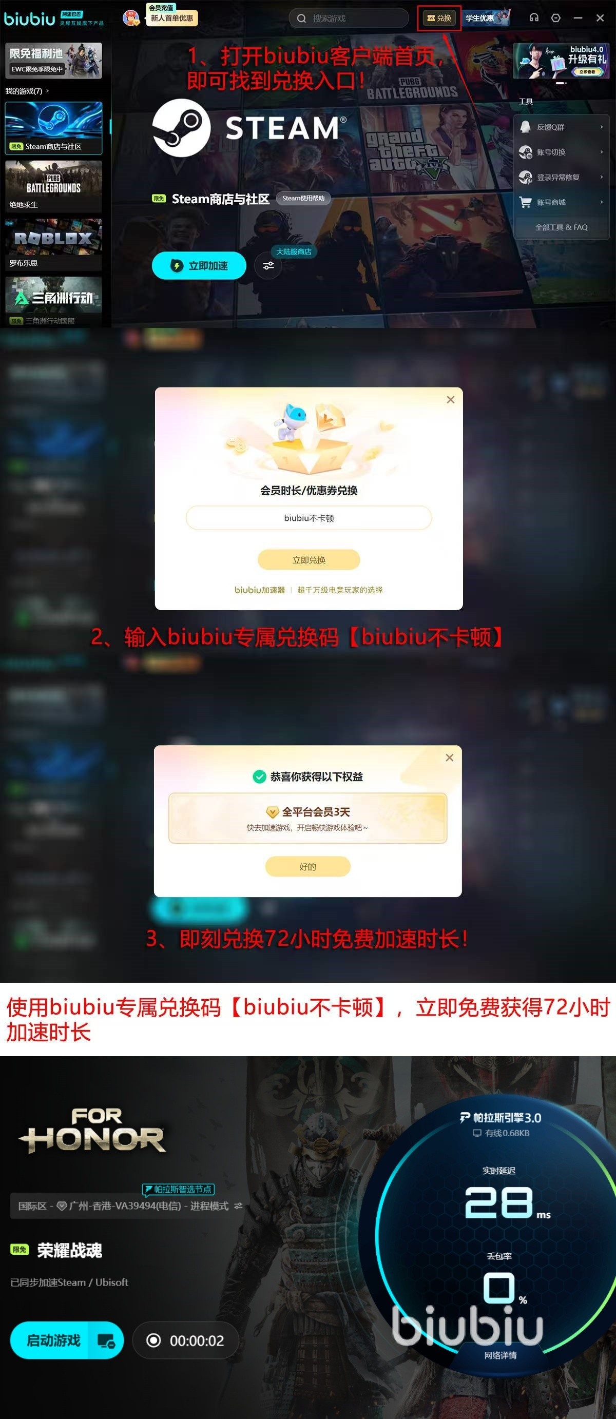 新人用户首次进入到这加速器的时候将会获取到24小时的免费加速时间。如果觉得这个不够用话,那可以先去使用兑换码【biubiu不卡顿】,这个兑换码也能让我们获取3天免费加速时间。