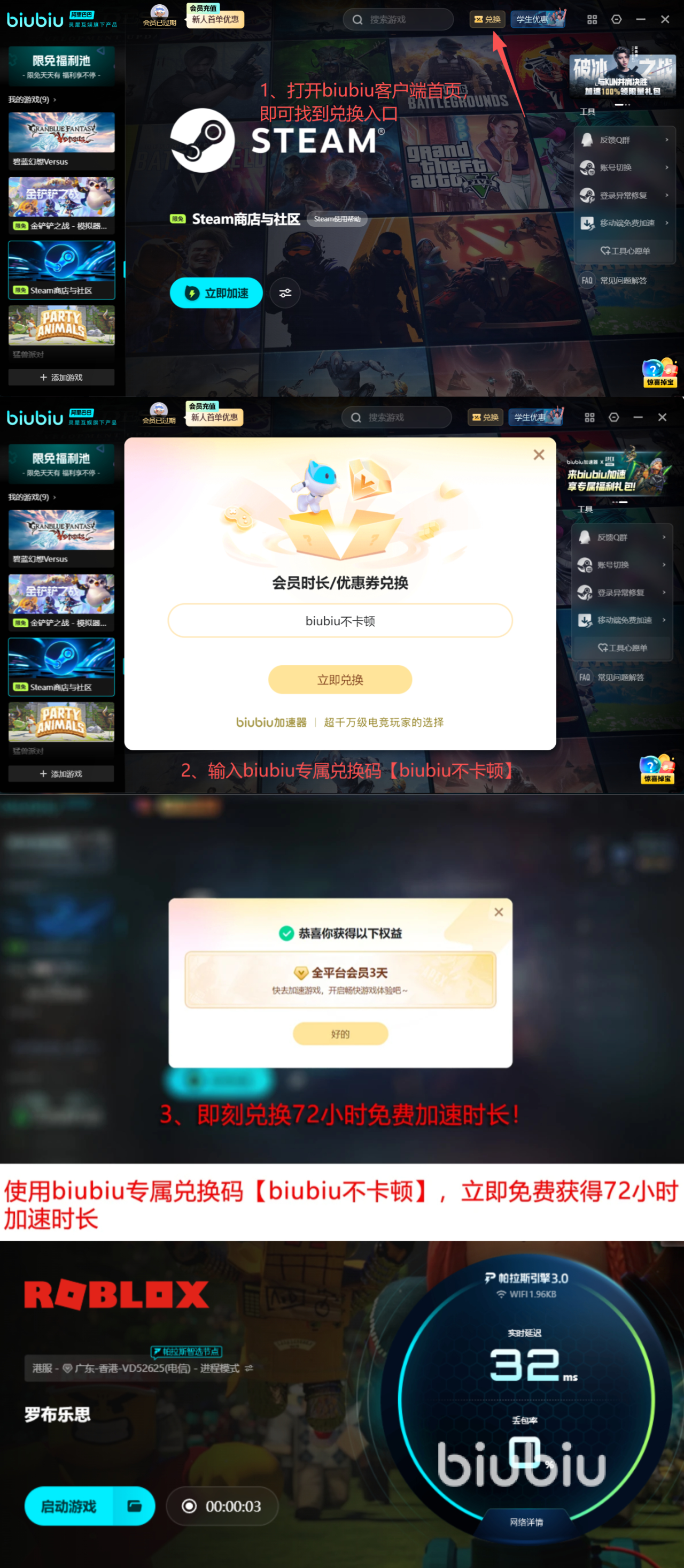 biubiu加速器特意推出了专属激励方案,所有初次注册的新用户都能免费享受到24小时全平台无门槛加速服务券。当“biubiu不卡顿”口令被激活之后,用户还将额外获得72小时通用加速权限,此优惠与基础礼包可并用,总时长可达到96小时。须知,【biubiu不卡顿】与【biubiu007】这两种专享码每位用户只能选择其一参与兑换。