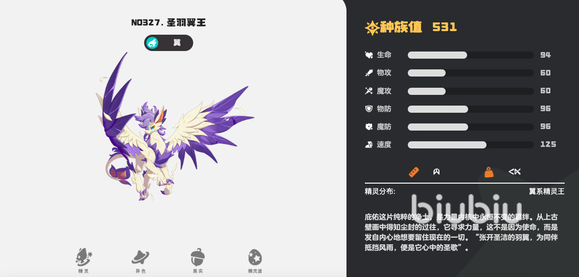 从形象设计来看,圣羽翼王延续了射手座主题的羽翼造型与流线型身姿,整体视觉风格与觉醒射手宫保持高度统一。它同样具备卓越的空中机动性,可作为常驻飞行坐骑使用,大幅提升地图探索效率。基础种族值总和为531,速度属性突出,在二段进化翼系宠物中稳居中上游水平;物防与魔防数值均衡,但物理攻击成长相对平缓,更适合承担战术支援与节奏控制角色。