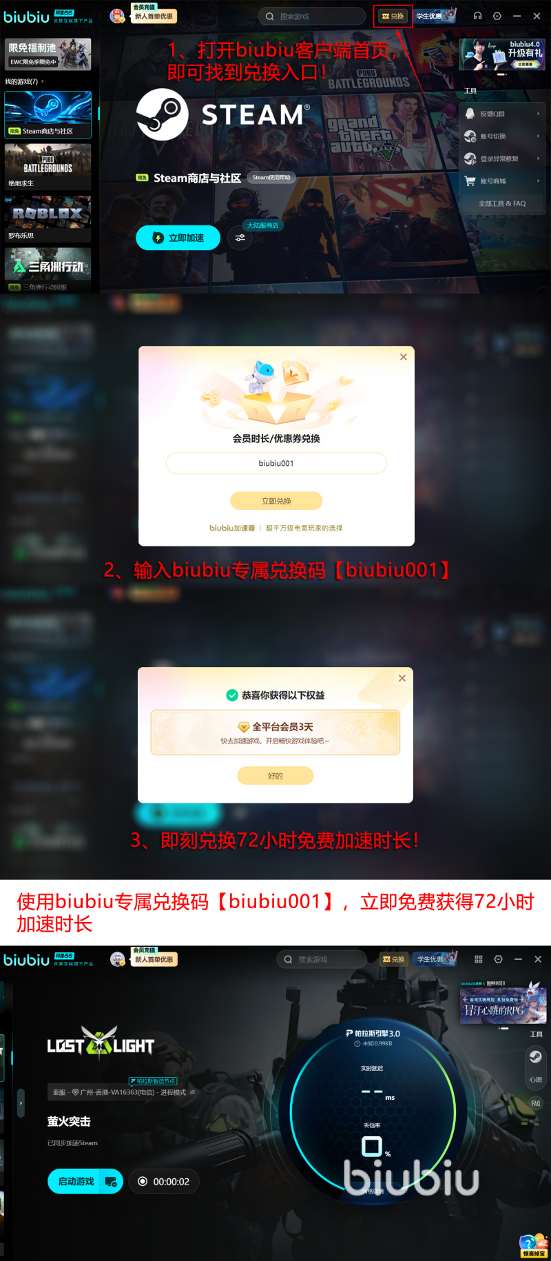 目前也推送出相应的福利,所有新老用户都可以参与试用活动,免费获得加速时长,如果你是新注册的账号,官方会直接发放24小时免费加速福利,所有新老玩家还可利用口令【biubiu001】成功解锁三天免费加速时长,这也意味着所有新用户都有机会领取96小时免费加速时长。