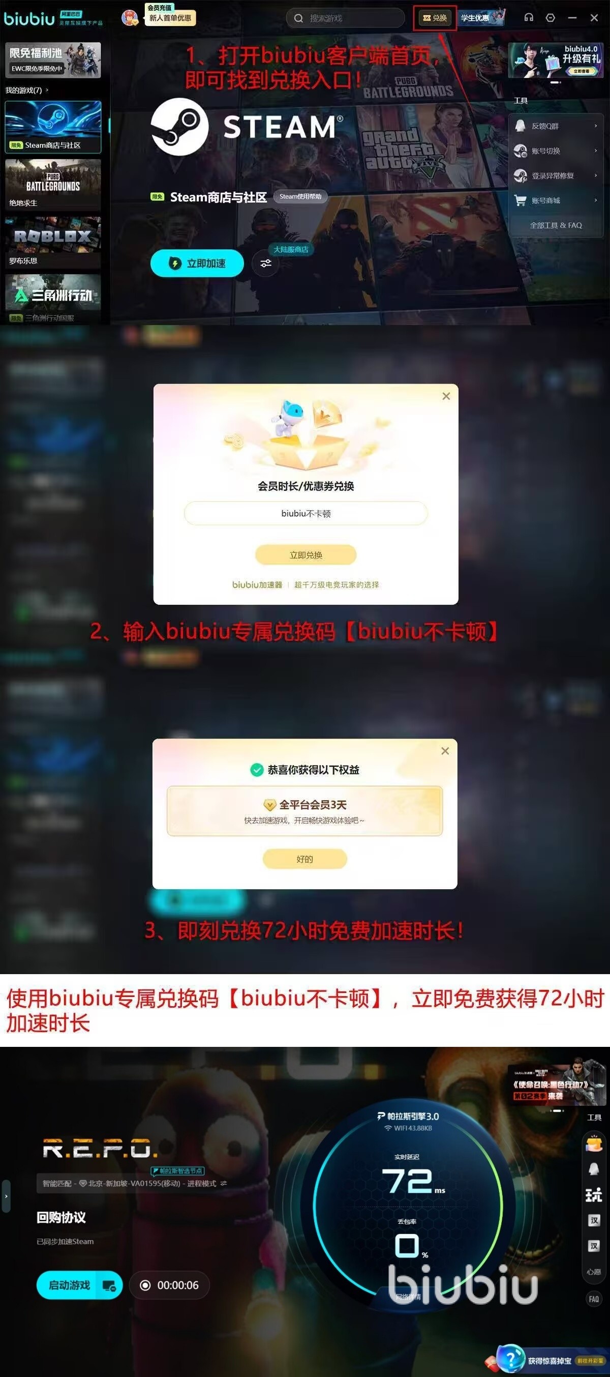 原有的基础福利持续生效,24h免费新人礼,只要是第一次注册登录就可以轻松拥有,而【biubiu不卡顿】这句口令能让平台的所有用户,拿到72个小时继续的加速时间。两种活动口令都是小写字母,如何选择大家一定的要仔细斟酌哦,因为不论是哪种福利都只能兑换领取一次。