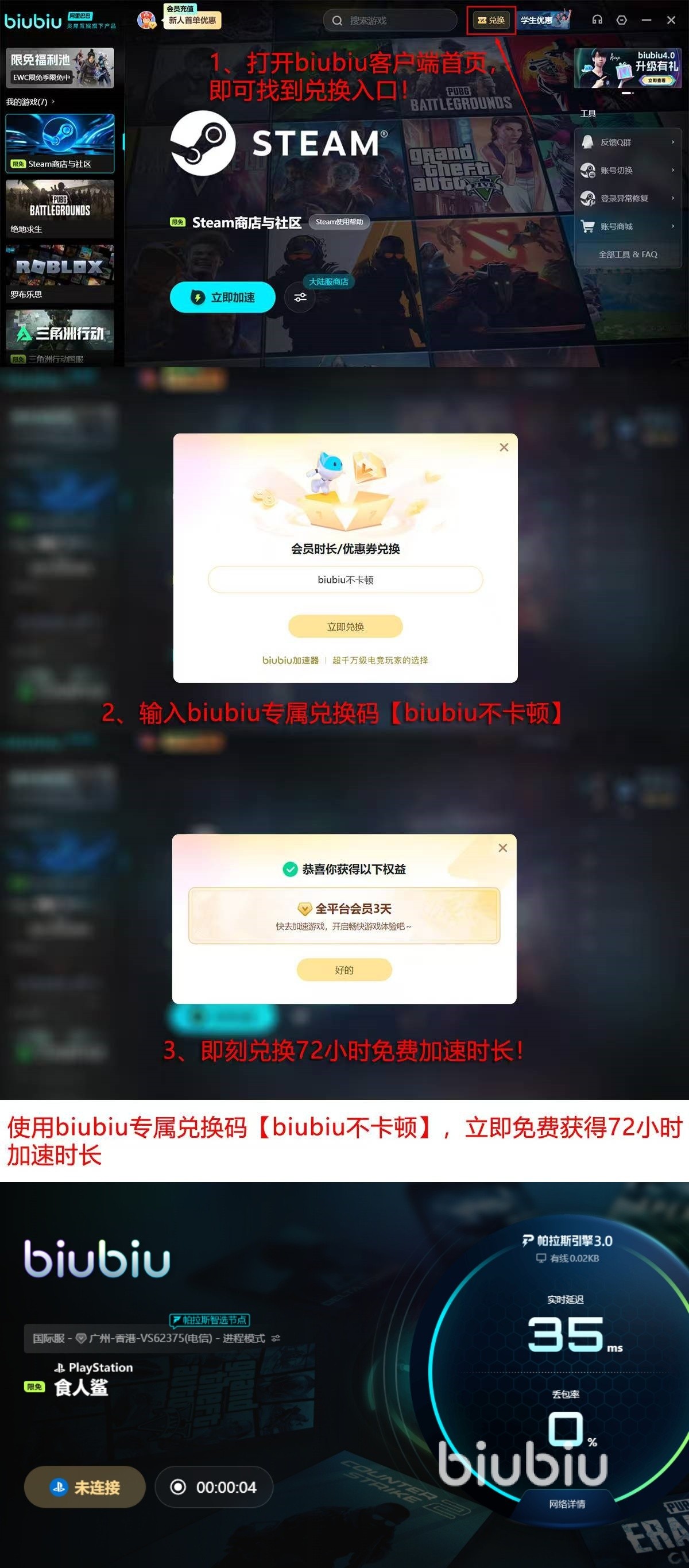 现在新用户在第一次使用biubiu的时候还有着额外的奖励。新用户第一次进入biubiu可以获取到24小时的免费加速。如果使用兑换码【biubiu不卡顿】,则还可以额外的获取到72小时的免费加速时间。