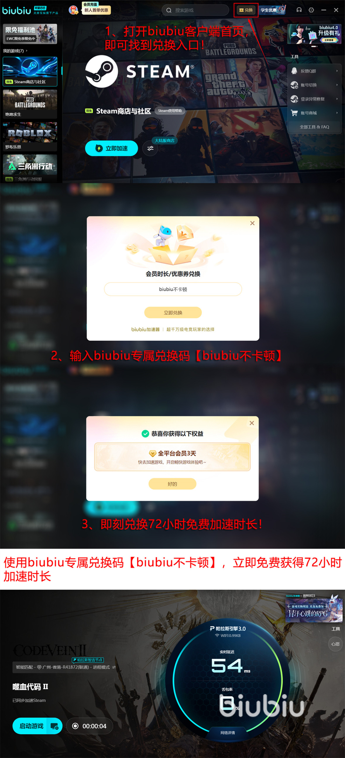 新注册用户可享biubiu加速器首号免费加速福利:输入兑换码【biubiu不卡顿】,即可领取72小时高级加速时长。叠加首次登录自动赠送的24小时基础加速,新账号总计可获得96小时无门槛加速服务。