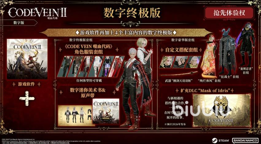 《噬血代码2》终极版定价为国区468元,限时优惠后为421元。该版本并非简单叠加DLC,而是整合了六大核心权益:第一,完整游戏本体;第二,自定义套装包,含三套独特外观及专属武器;第三,已确认将于2027年1月上线的扩充DLC——“时空狭缝”独立剧情(非首发即送);第四,收录前作人气角色服装套组,涵盖伊奥、路易等共计6套经典造型;第五,附赠数字迷你美术集与官方原声音乐集;第六,预购专属福利(含提前三天解锁资格、孤狼双剑及造型彩绘),需注意此项仅限发售前完成预购方可生效,现已失效。