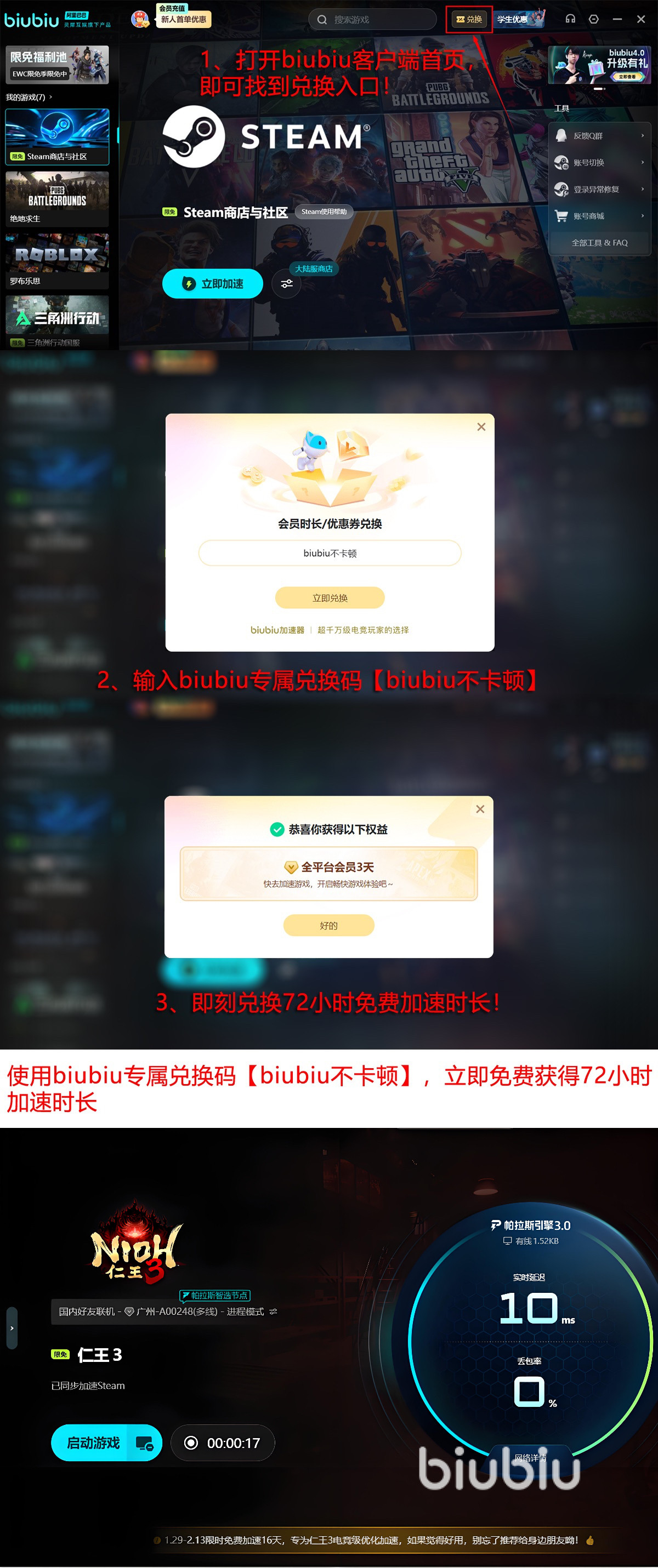 新用户注册biubiu账号即可获赠24小时免费加速时长;此外,所有用户均可在兑换中心输入激活码【biubiu不卡顿】领取额外72小时加速权益,相当于为《仁王3》开荒期提供全程网络保障,大幅降低Boss战中因延迟突变导致的操作失效风险。