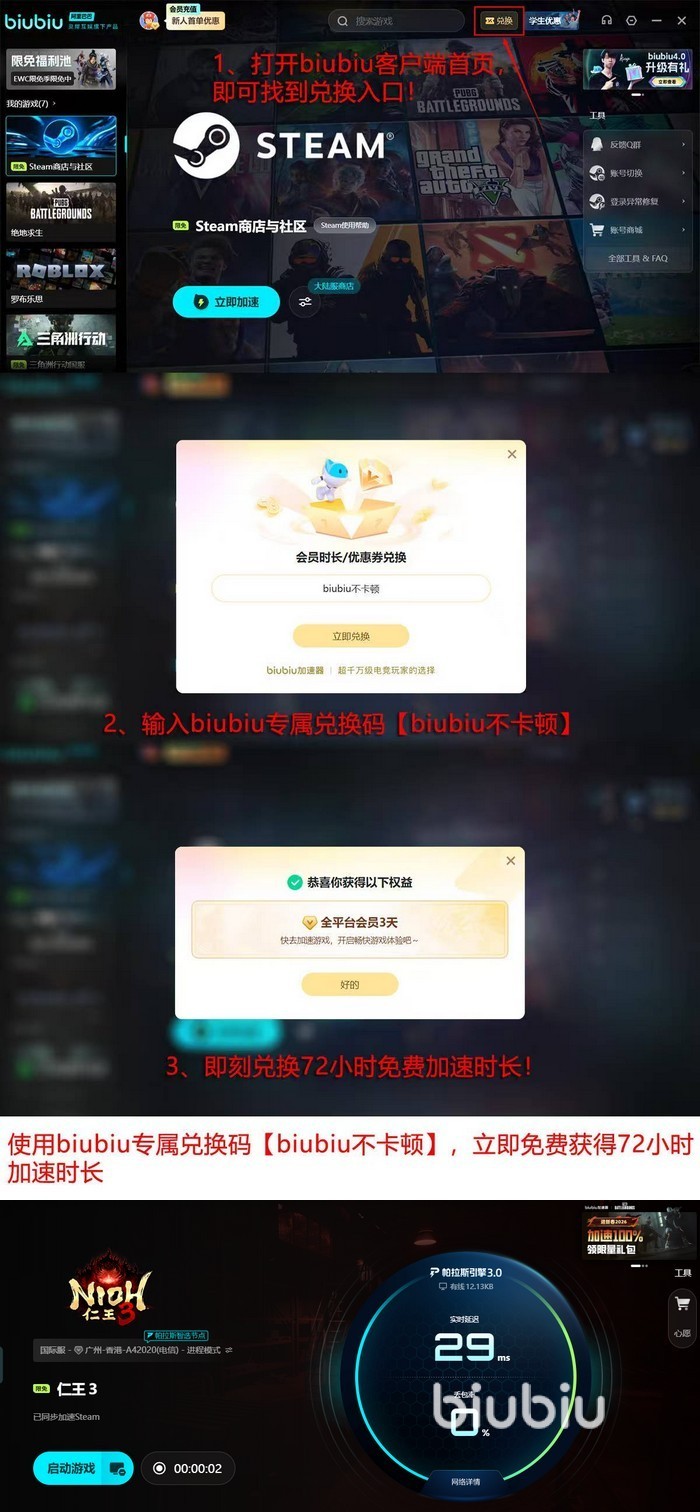 需特别注意,《仁王3》标准数字版安装包体积达125GB,对网络带宽与下载稳定性要求较高。推荐使用biubiu加速器进行下载与更新——其最新搭载自研帕拉斯引擎3.0,显著提升数据传输效率;同时联合《绝地求生》职业选手xdd共同参与网络链路调优,进一步保障下载流畅性。新用户注册即可获赠24小时全平台加速时长,叠加输入口令“biubiu不卡顿”兑换的3天会员权益,总计可享4天免费加速服务。