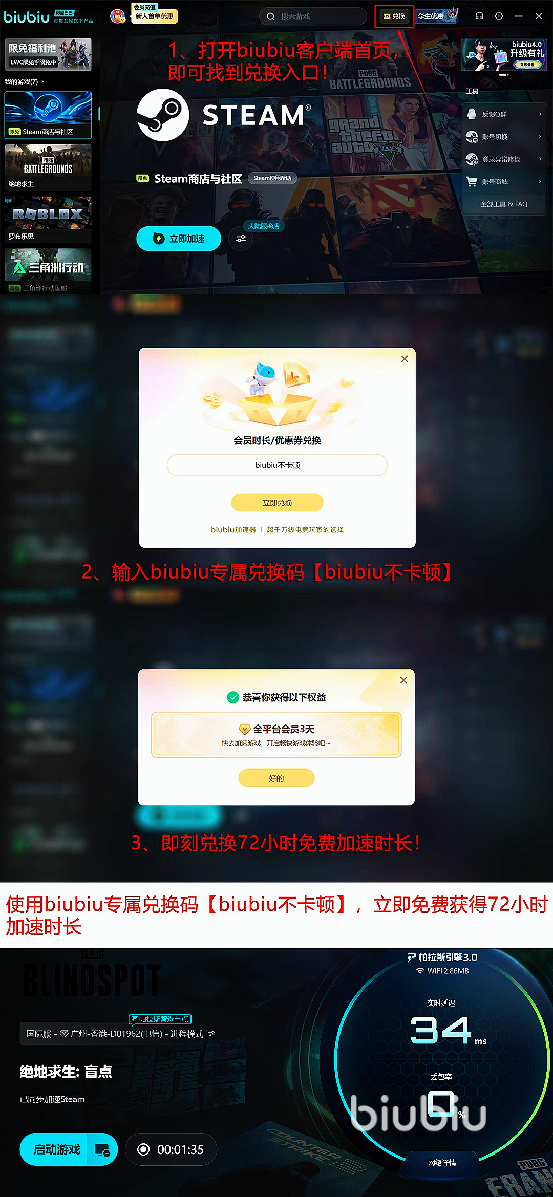 biubiu加速器面向全体用户提供普惠型加速权益,新用户完成账号注册后自动解锁24小时全游戏免费加速权限;所有用户凭兑换码【biubiu不卡顿】可额外获赠3天连续加速时长。新用户叠加两项福利,总计享有96小时无门槛加速服务,资源利用率与实用性显著提升。