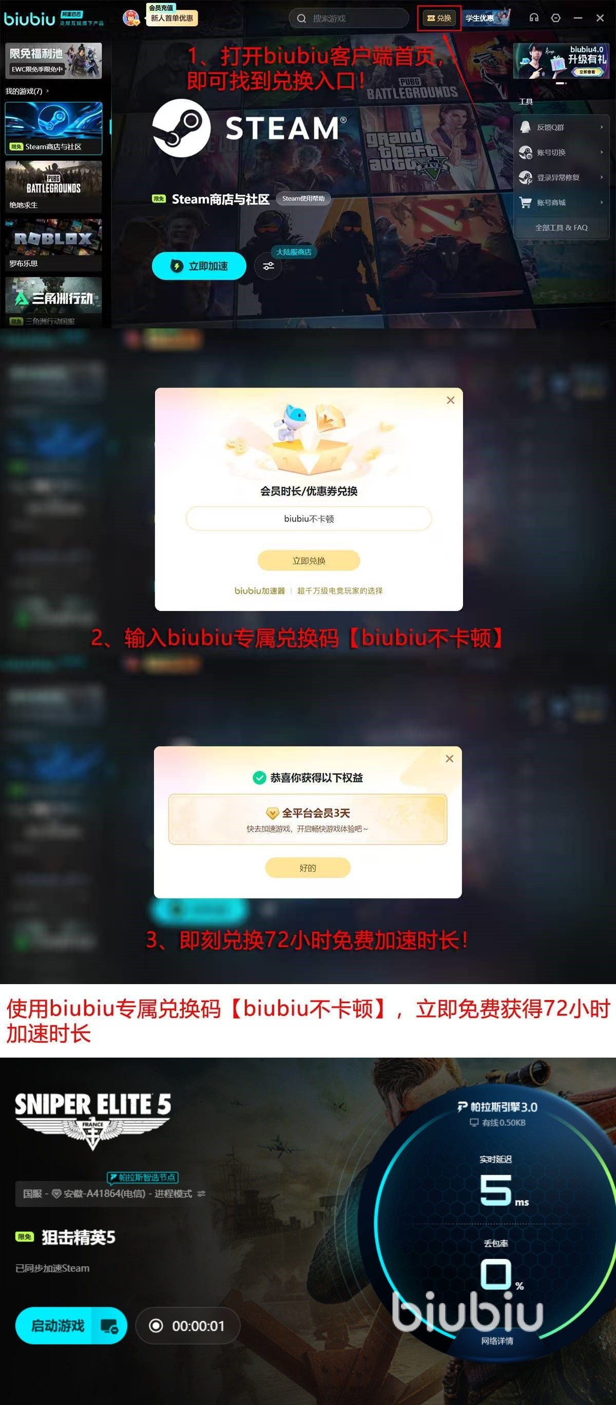 新用户可无门槛体验服务:首次启动biubiu加速器即自动激活24小时全功能免费加速权限。输入专属兑换码【biubiu不卡顿】,还可额外领取72小时连续加速时长,覆盖完整新手适应周期与多局实战测试需求。