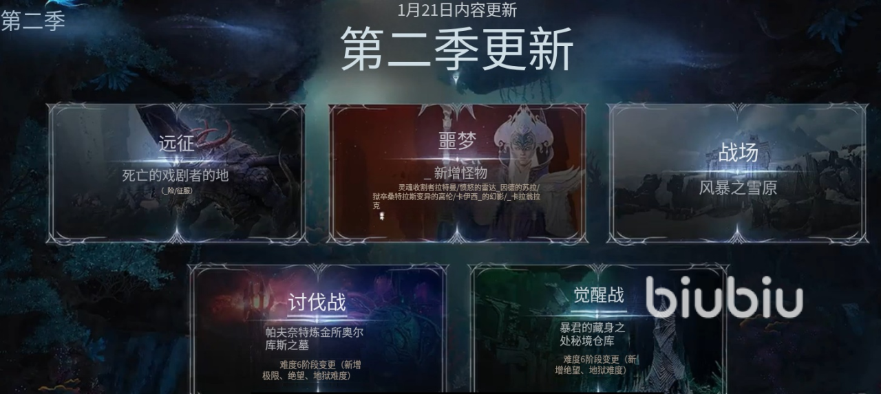 1月21日推出:远征副本【德拉玛塔巢穴】、讨伐战【奥迦斯心脏】和【法夫奈特提炼所】、觉醒战场【轨迹保管库】和【暴君藏身处】。